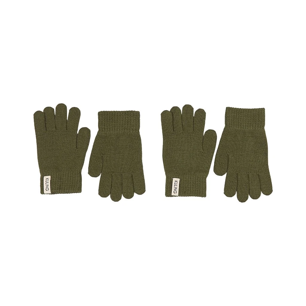 Keep little hands warm. Moss green Magic gloves by Kuling. The gloves have a knitted design. They have rib-knit cuffs.