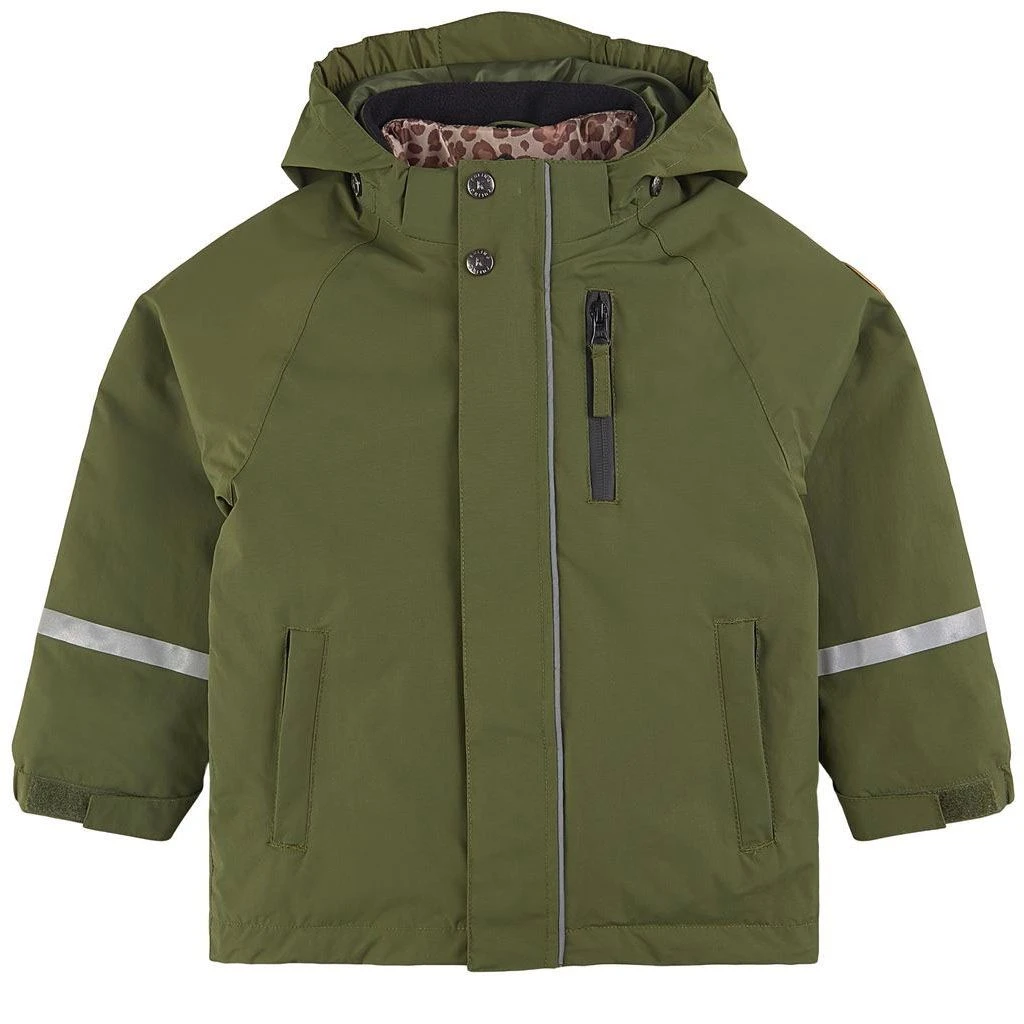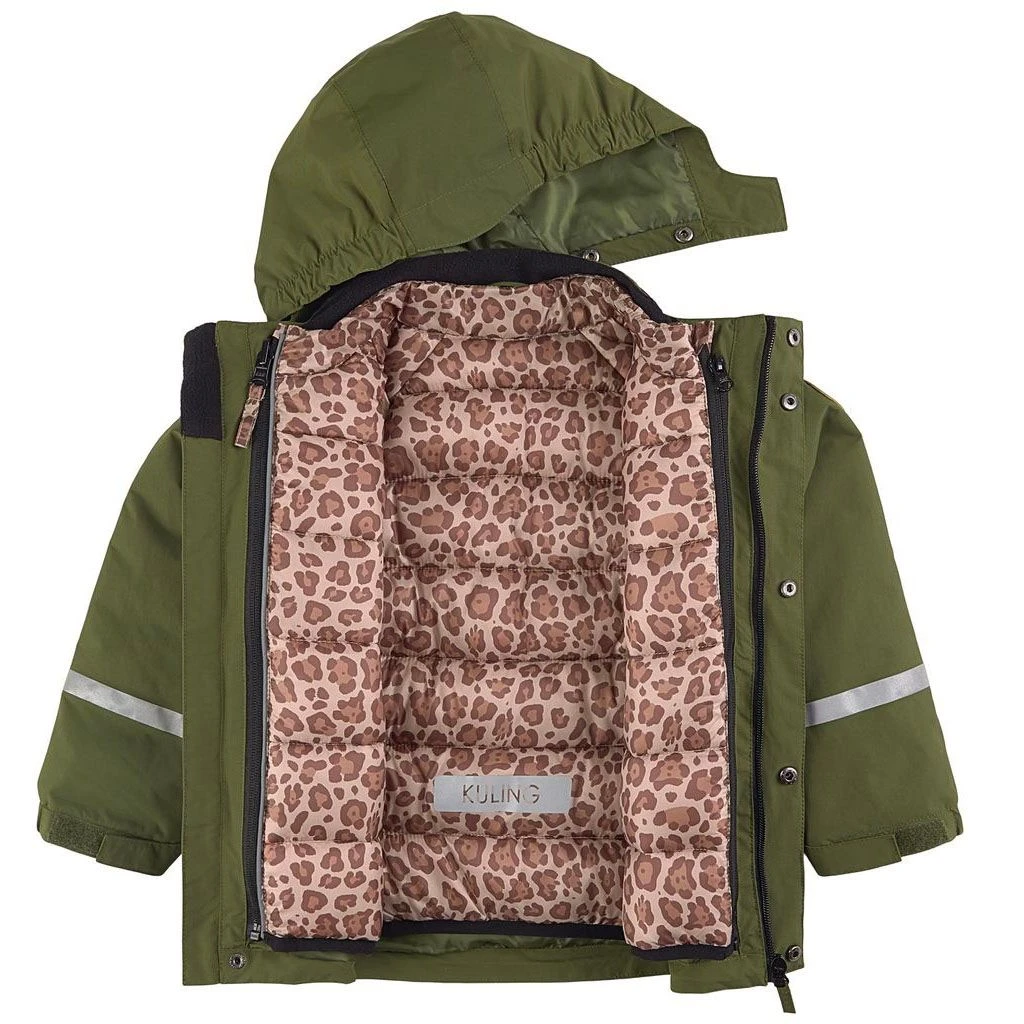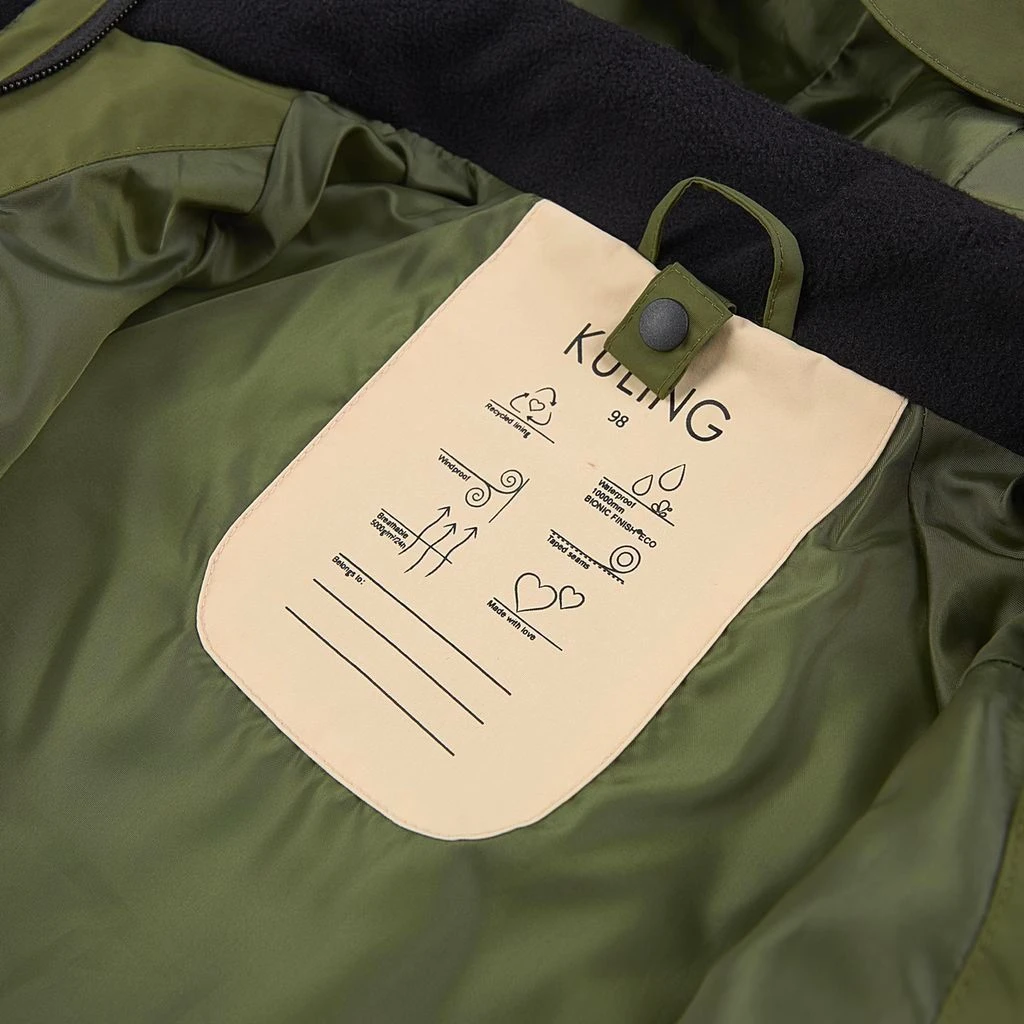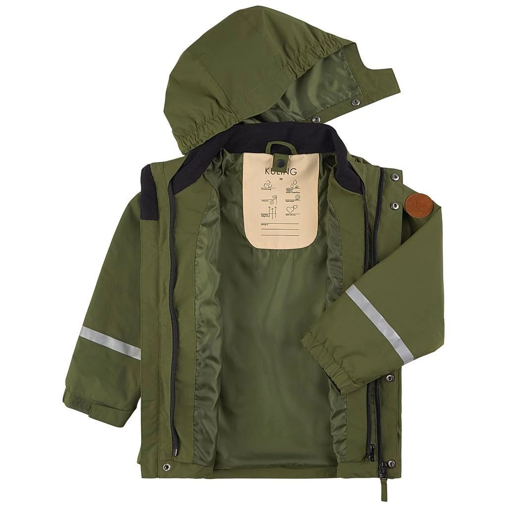 Get ready for outdoor adventures. Moss green Boden 3-in-1 shell jacket by Kuling. The jacket has taped seams. It has a detachable hood, a zip closure at the front, three front pockets, adjustable cuffs, reflective details for visibility and a detachable puffer jacket with light padding, a zip closure at the front and two front pockets.