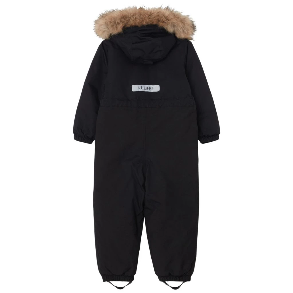 Be warm and comfy on winter adventures. Black Chamonix snowsuit by Kuling. The snowsuit has taped seams. It has warm padding, a detachable hood with detachable faux fur trim, a zip closure at the front, two front pockets, elasticated cuffs, a reinforcement at the seat and at the leg ends and detachable, adjustable silicone foot loops.