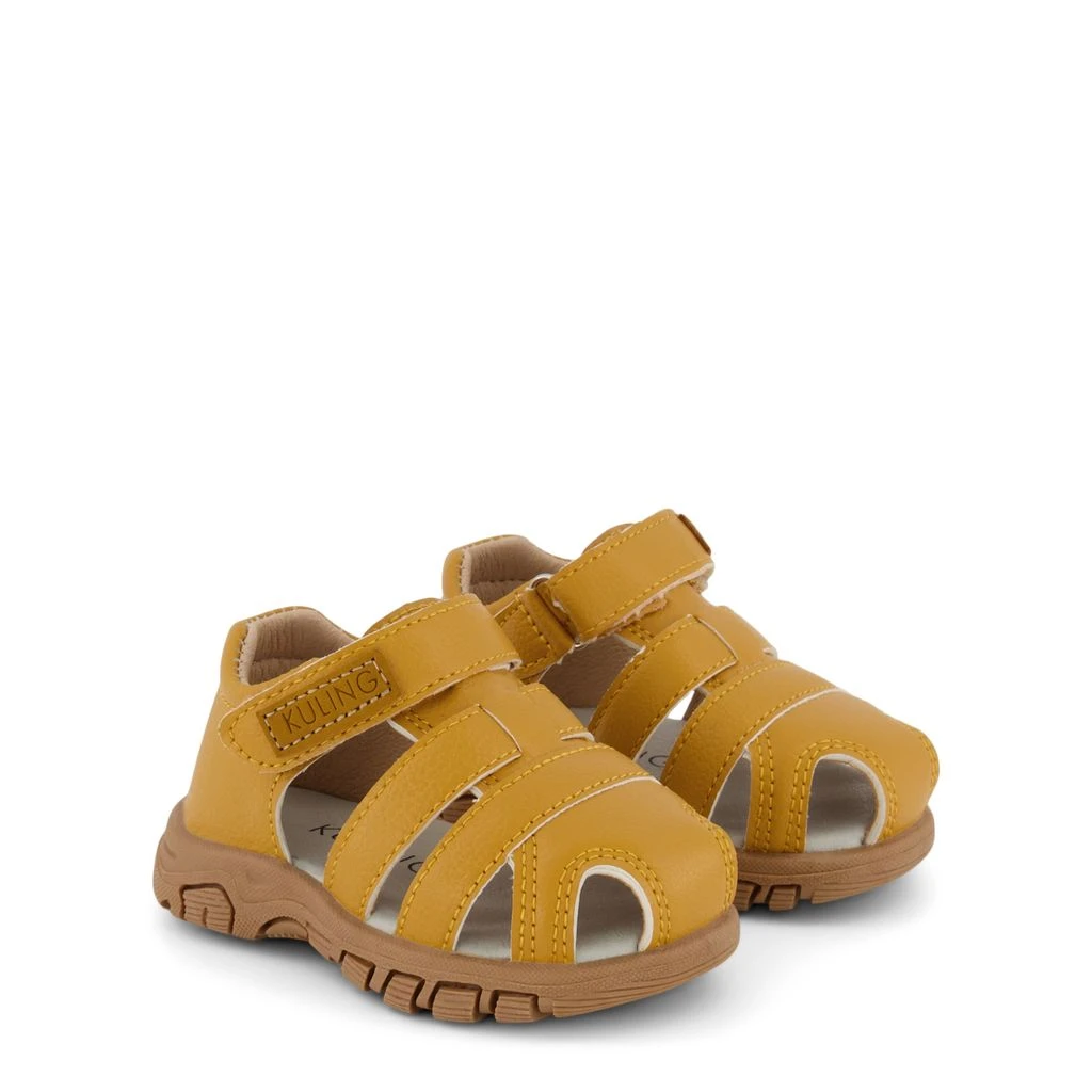 Mustard Dili sandals by Kuling. The sandals have a faux leather upper. They have closed toe, a velcro closure for easy on and off, a cushioned insole and a non-slip sole.