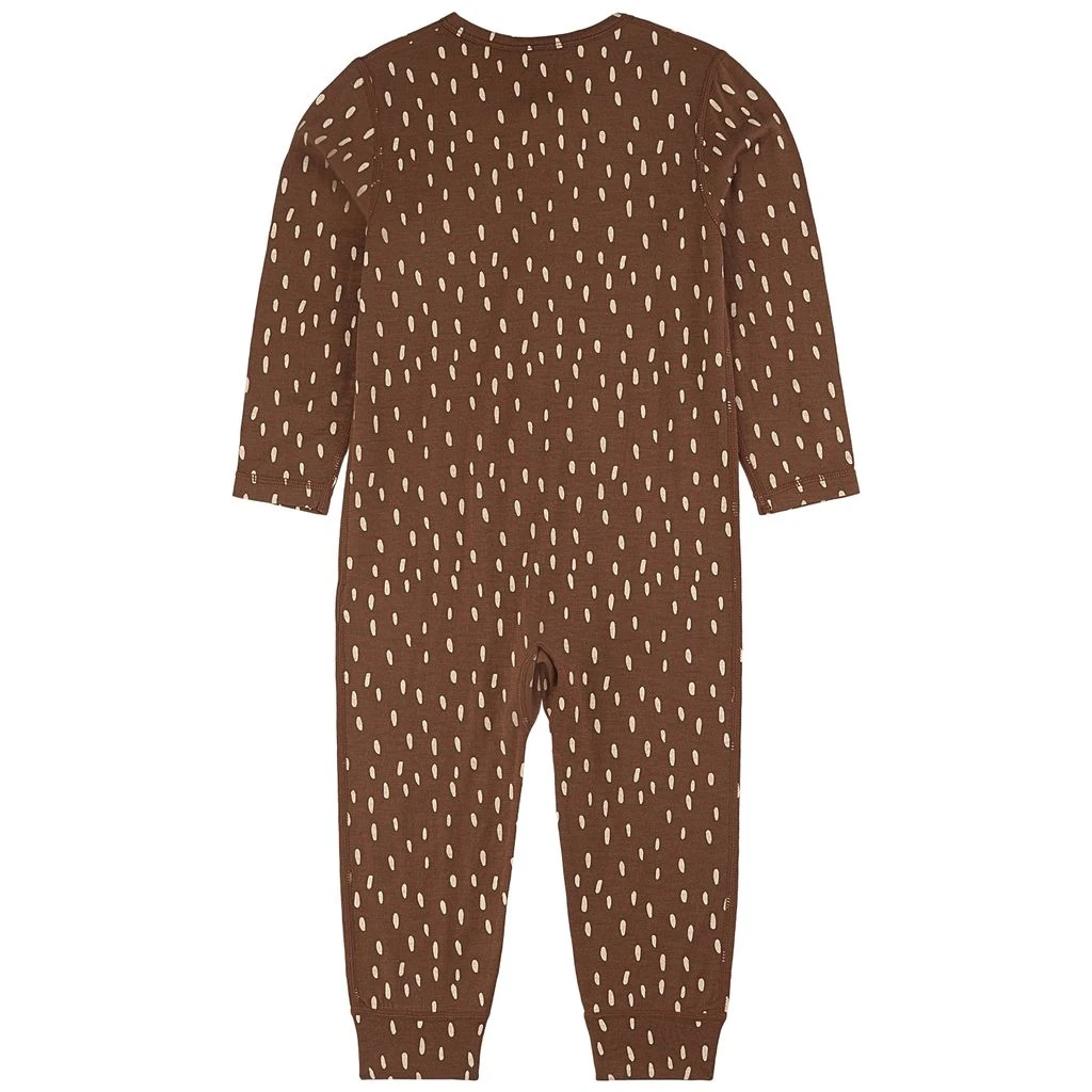 Let your baby explore and play in comfort. Brown one-piece by Kuling. The one-piece has a zip closure at the front.
