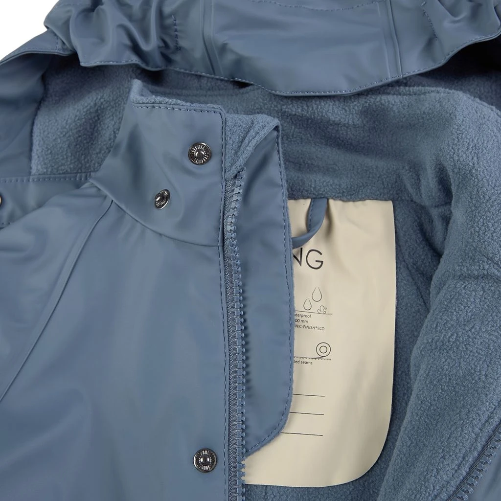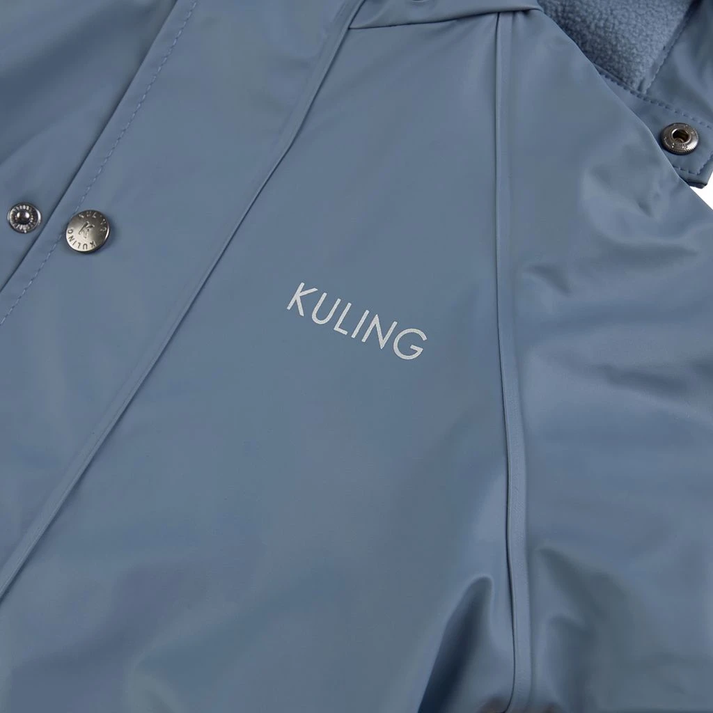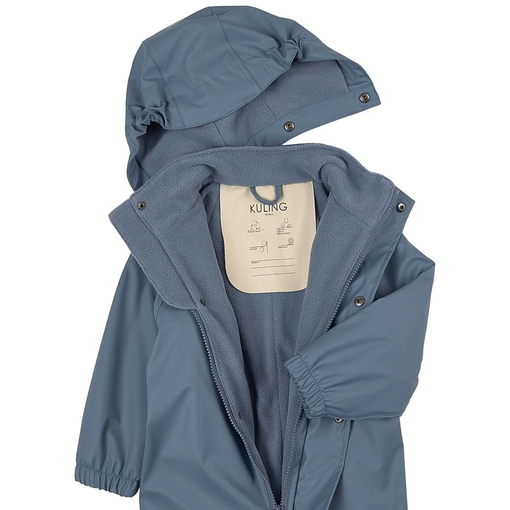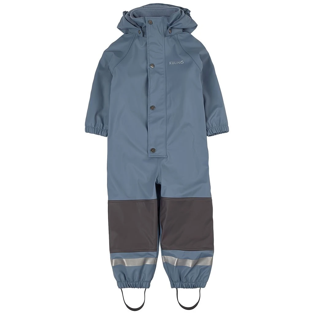 Time to jump through puddles. Blue Douglas rain coverall by Kuling. The coverall has welded seams. It has a soft fleece lining, a detachable hood, a zip closure at the front, elasticated cuffs, adjustable, detachable foot loops and reflective details for visibility.