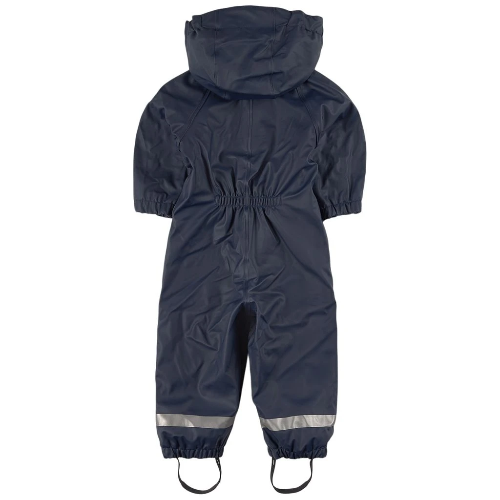 Navy Douglas Recycled rain coverall by Kuling. The coverall has welded seams. It has a zip closure at the front with a YKK® zipper, a detachable hood, elasticated cuffs, reinforced knees, a durable silicone foot loop and reflective details at the end of the legs for visibility.
