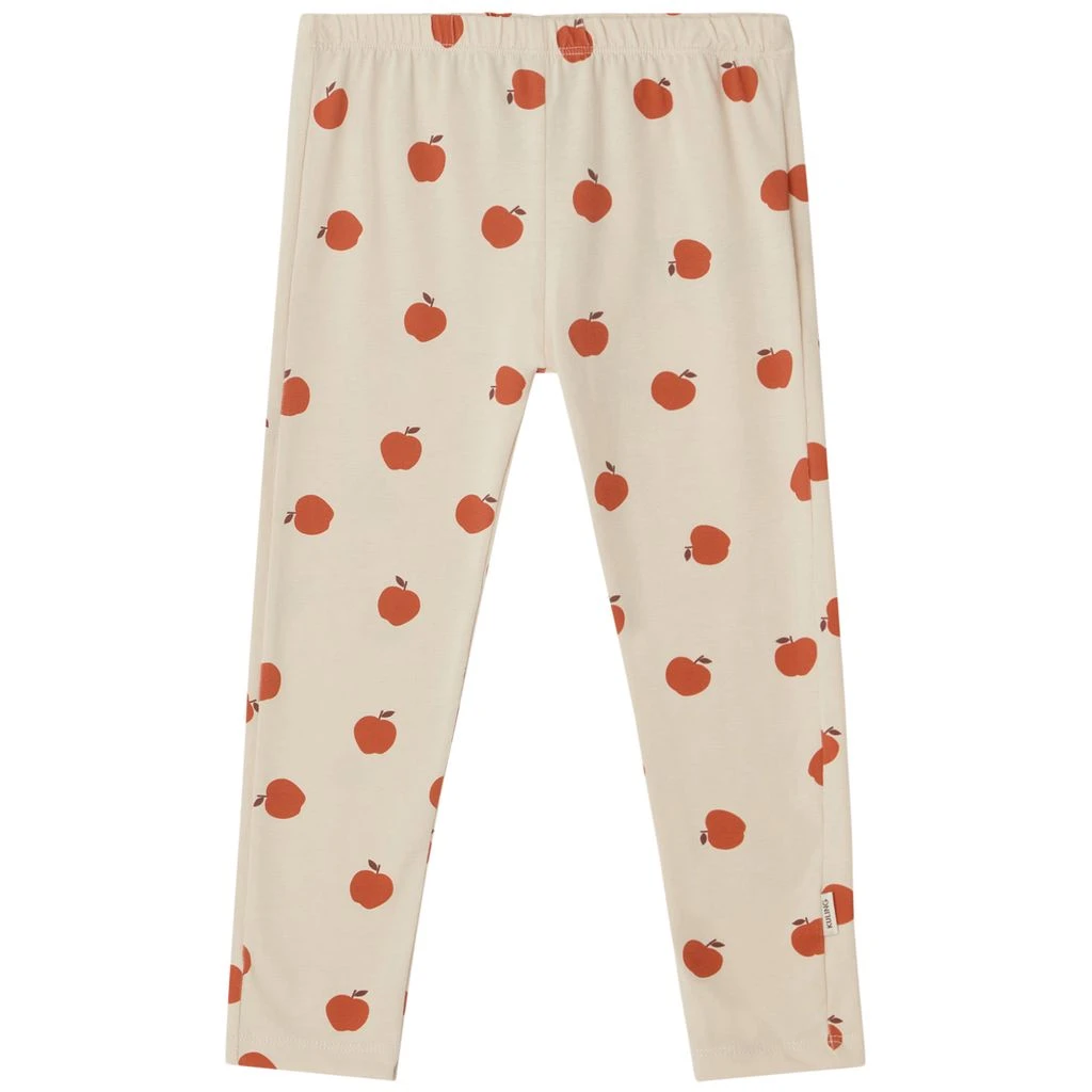 Be eco-friendly and feel amazing in these leggings. White GOTS Serrai leggings by Kuling. The leggings have an all-over print with apples. They have an elasticated waist.