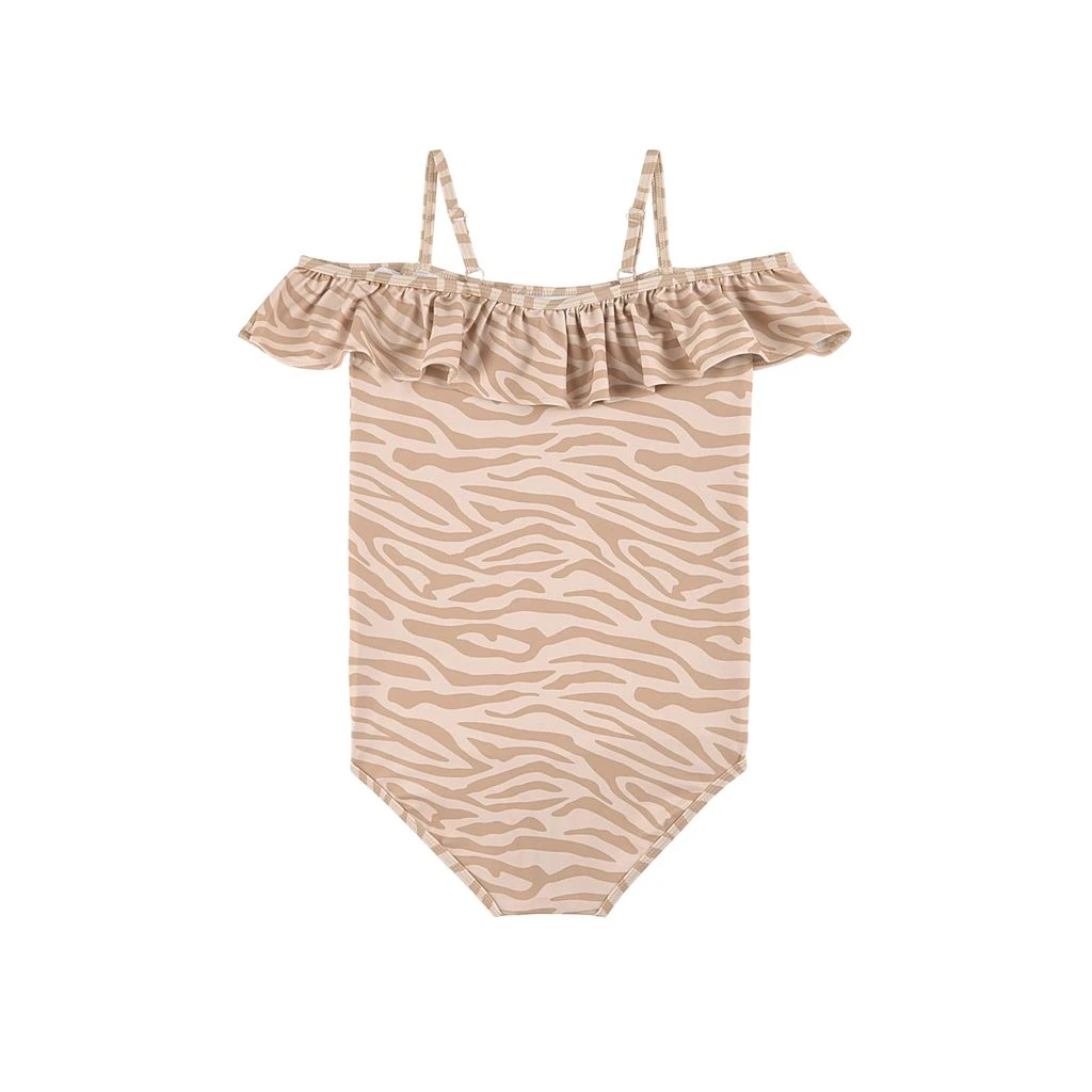 Time to go for a swim. Sand Grace Bay swimsuit by Kuling. The swimsuit has a quick dry, stretchy material. It has an off shoulder look with ruffle detailing, spaghetti straps with bows and a lined front.