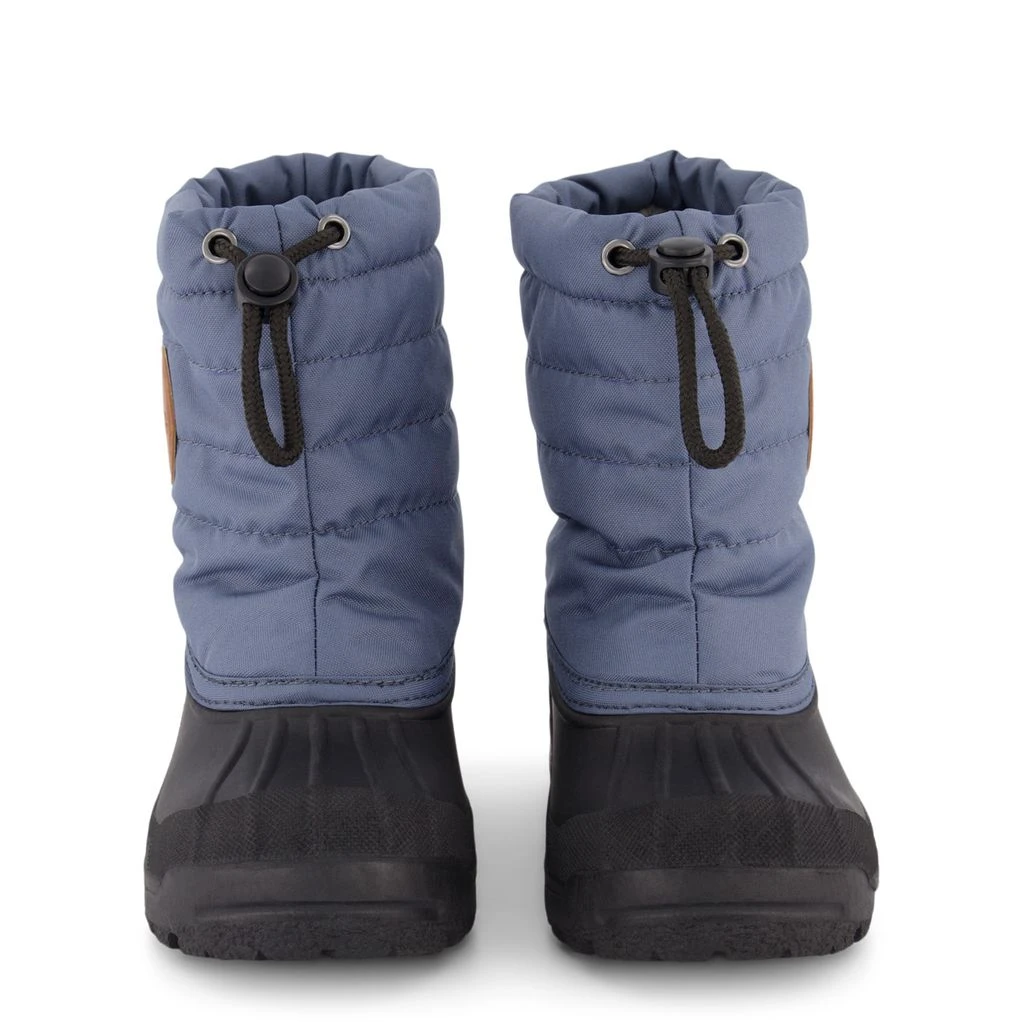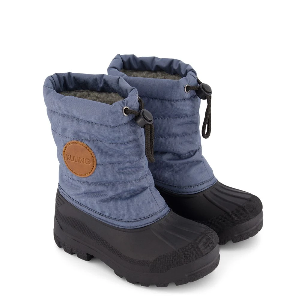 Blue Isaberg winter boots by Kuling. The winter boots have a cozy fleece lining. They have a padded shaft for warmth, an adjustable cinch cord, a reflective detail for visibility and a rubber sole with rough tread for a sure step.