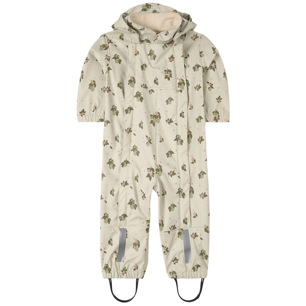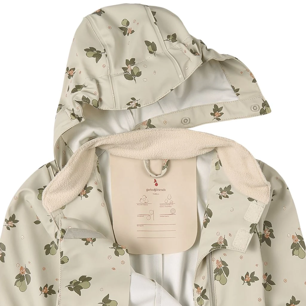 Kuling x Garbo & Friends Poire Print rain coverall by Kuling. The coveralls have welded seams. They have a detachable hood, double YKK® zippers at the front, elasticated cuffs, adjustable silicone foot loops and reflective details for visibility.