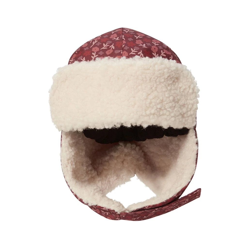 Keep little heads warm. Purple Levi trapper hat by Kuling. The trapper hat has taped seams. It has a soft fleece lining, a velcro closure at the chin and teddy fleece lined earflaps.