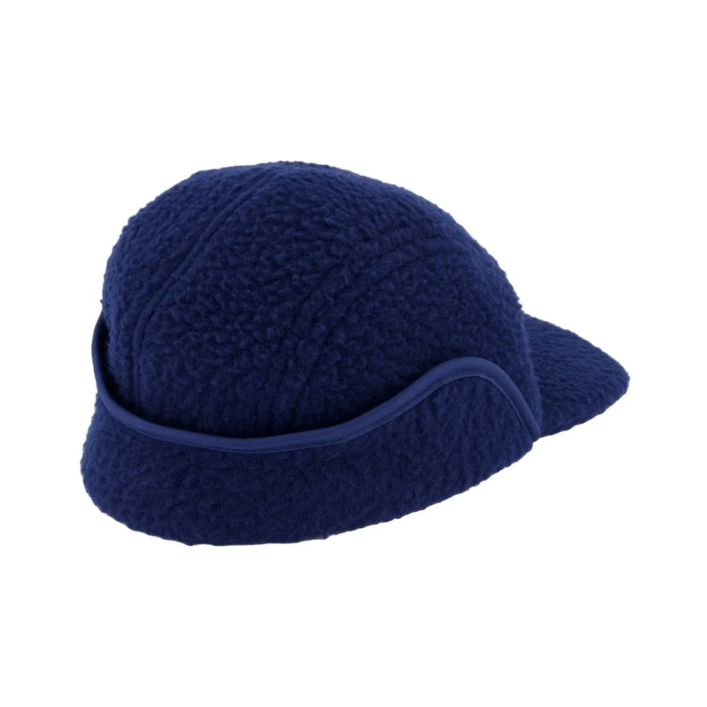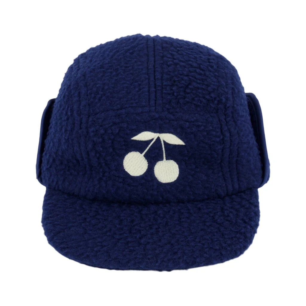 Navy Limited Edition Cherry Pile Fleece cap by Kuling. The cap has a soft fleece material. It has a flat bill, a longer material at the back and an embroidered cherry at the front.