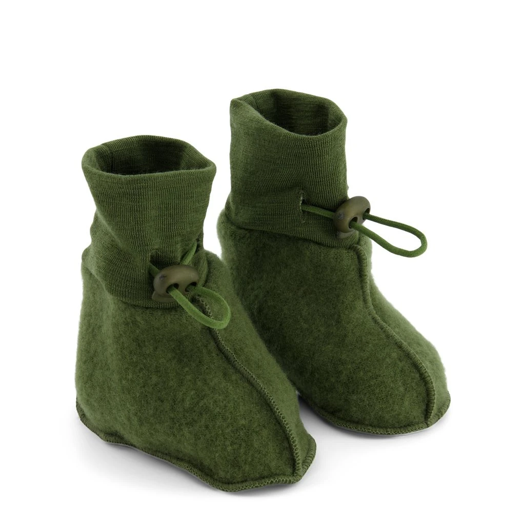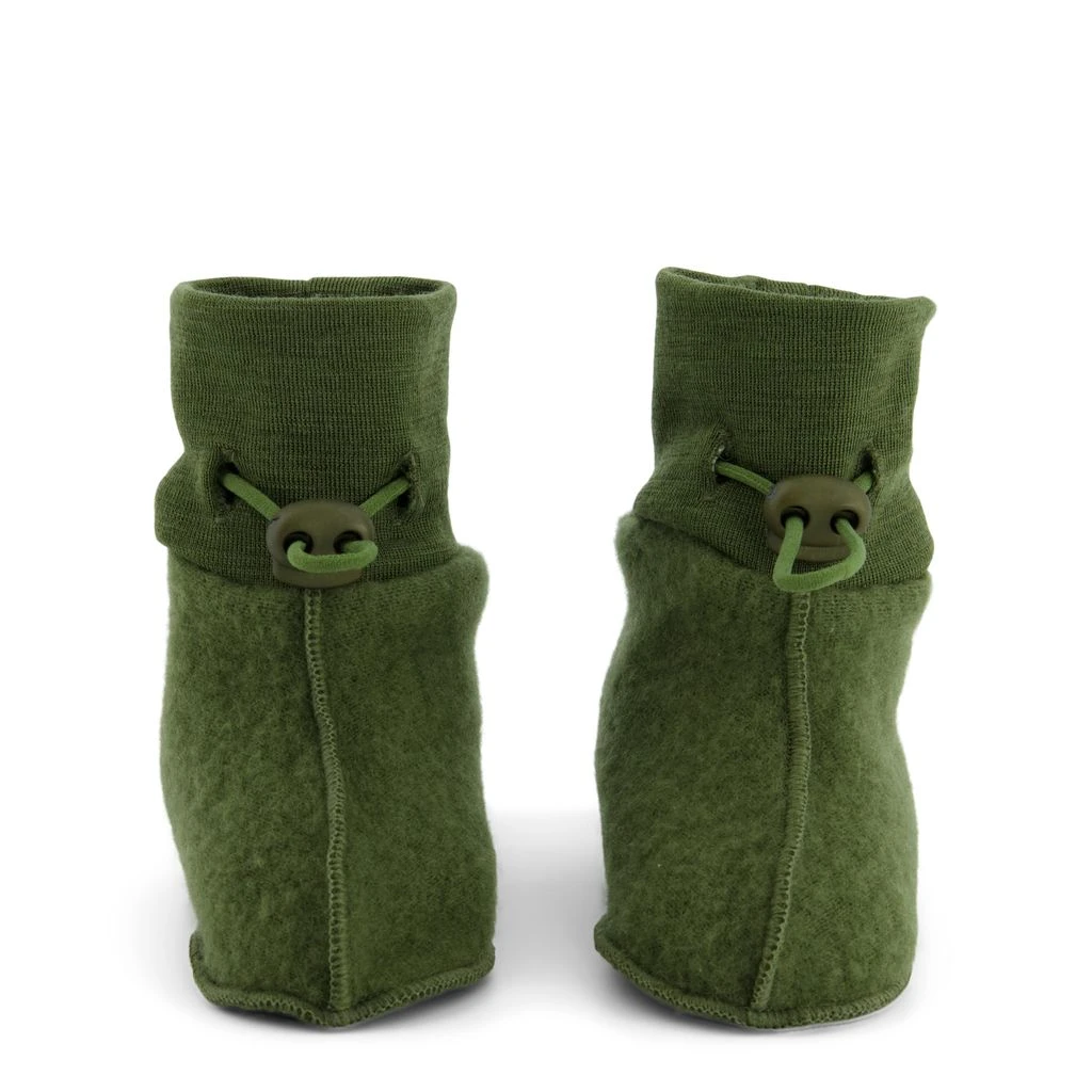 Moss green Merino booties by Kuling. The booties have a soft fleece material. They have ribbed cuffs and an adjustable toggle for a comfy fit.