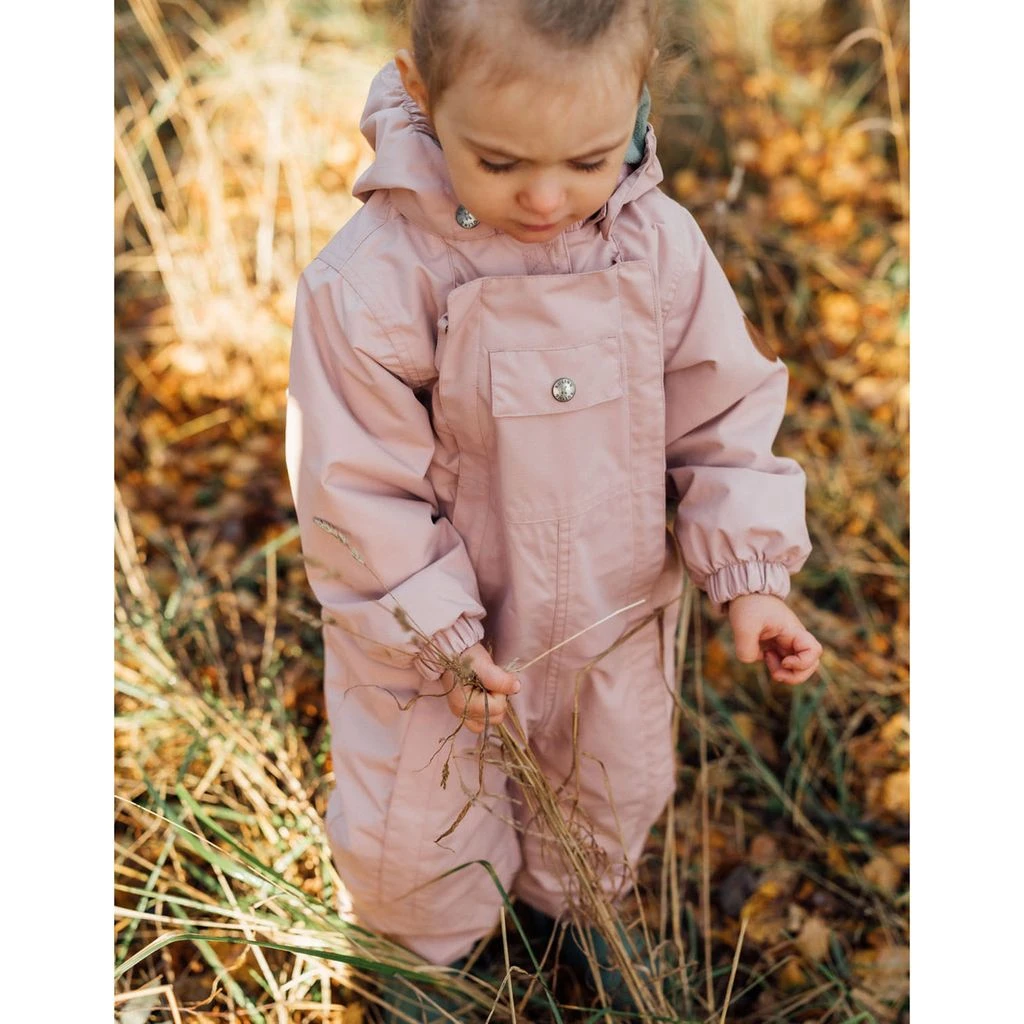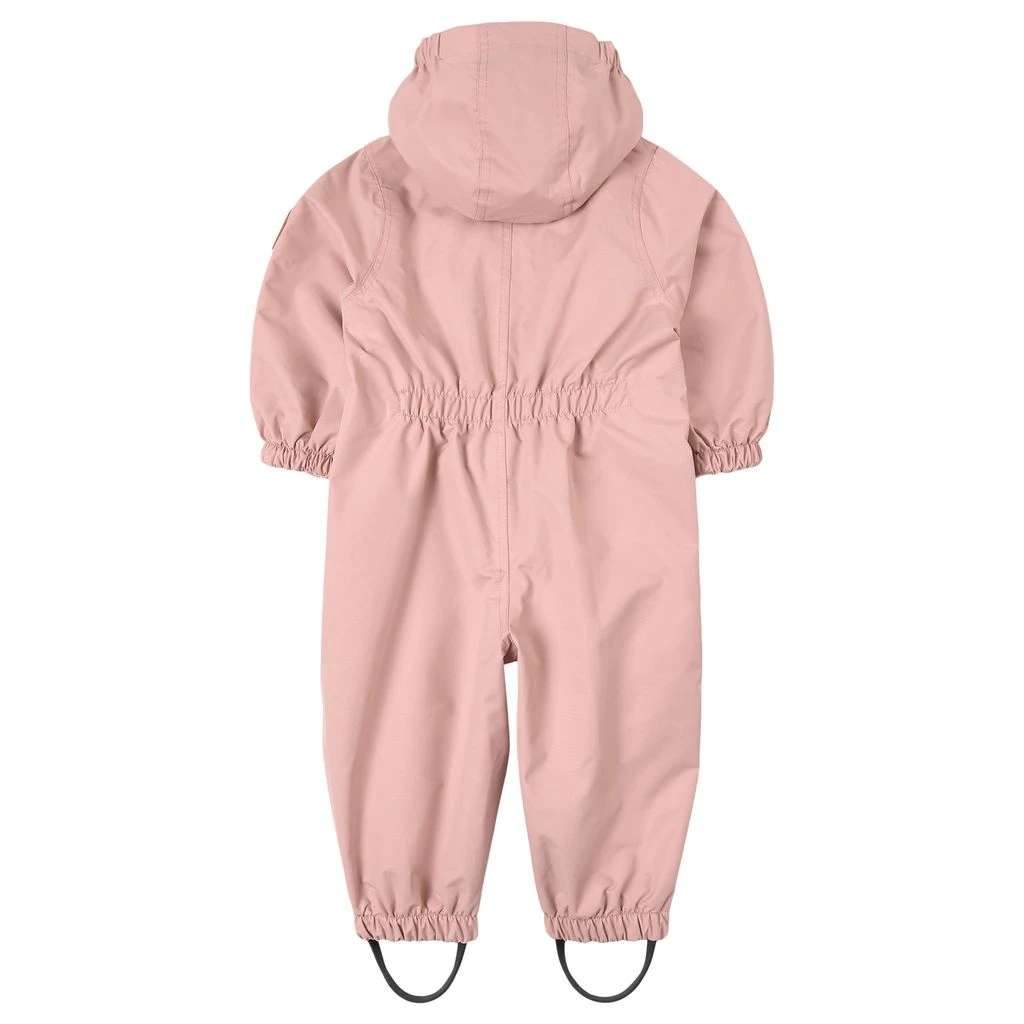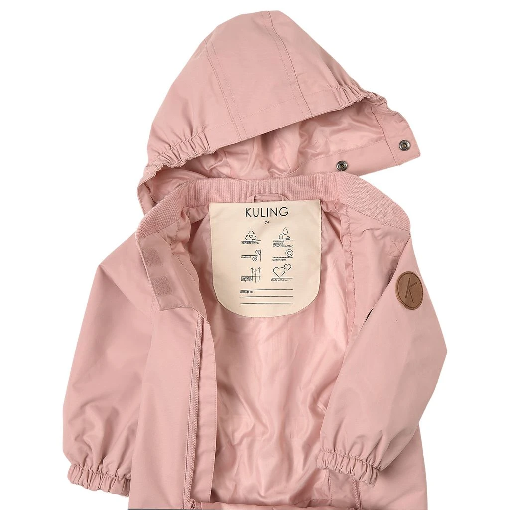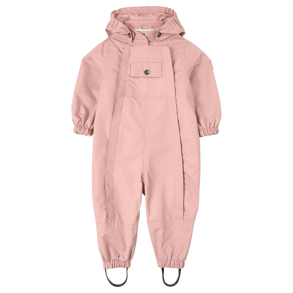 Pink Milano shell coverall by Kuling. The shell coverall has taped seams. It has a YKK® zipper at the front, a detachable hood, elasticated cuffs, durable silicone foot loops and reflective details for visibility.