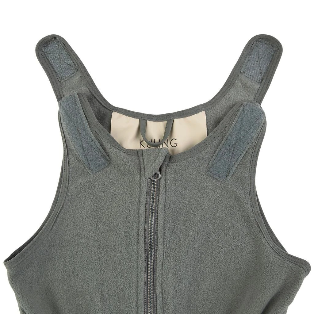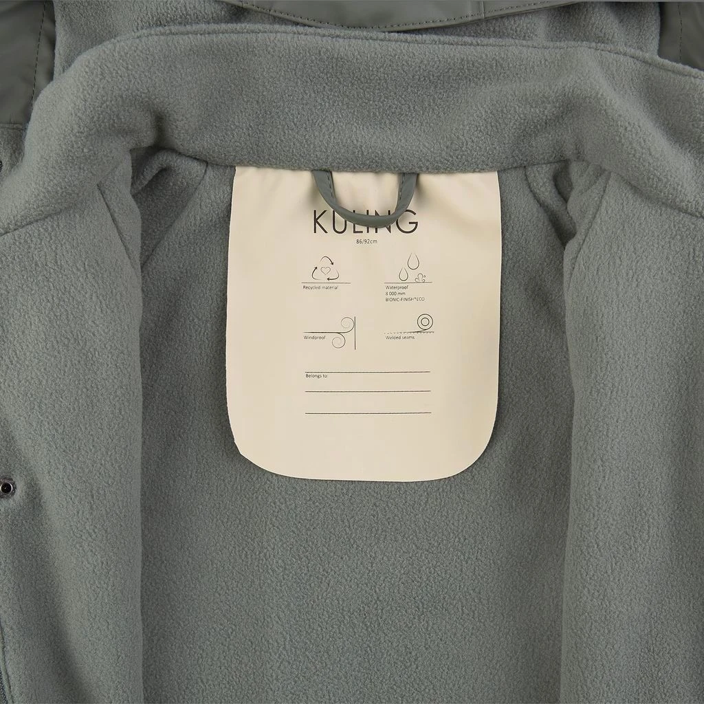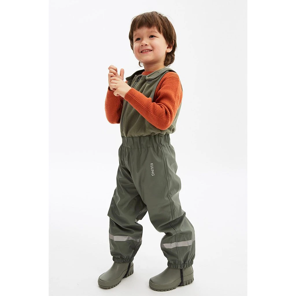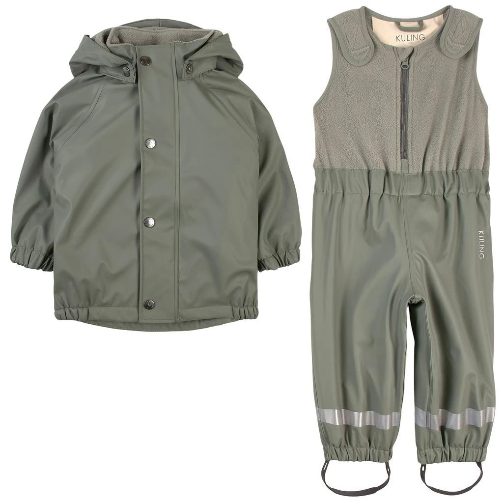 Light green Ottawa rain set by Kuling. The set has welded seams. It has a fleece lining, reflective details for visibility, pants with a bodice in fleece, a velcro closure at the shoulders, a YKK® zipper at the front, an elasticated waist and durable, adjustable silicone foot loops and a jacket with a detachable hood, a YKK® zipper at the front and elasticated cuffs.