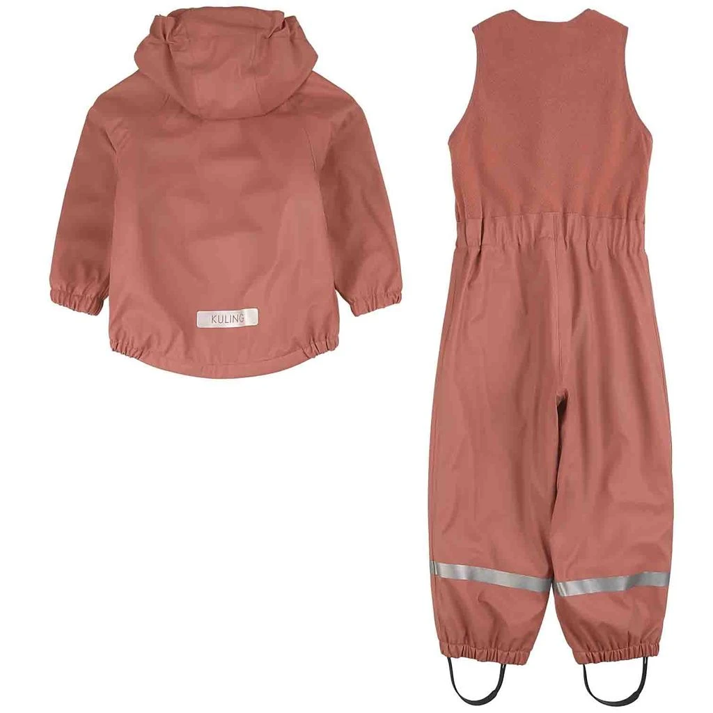 Time to jump through puddles. Pink Ottawa rain set by Kuling. The set has welded seams. It has a soft fleece lining, a jacket with a detachable hood, a YKK® zipper at the front and elasticated cuffs, pants with a fleece bodice, velcro closure at the shoulders, a YKK® zipper at the front, an elasticated waist and durable, adjustable silicone foot loops and reflective details for visibility.