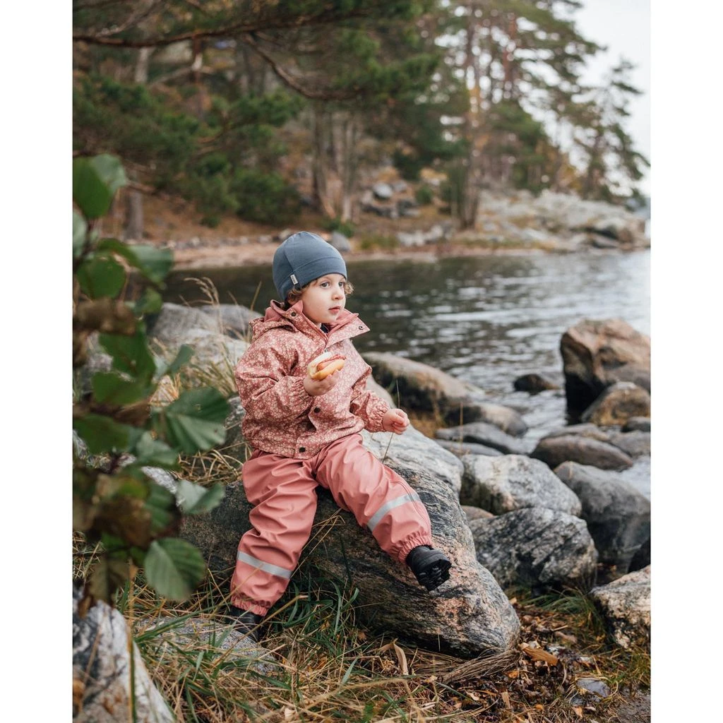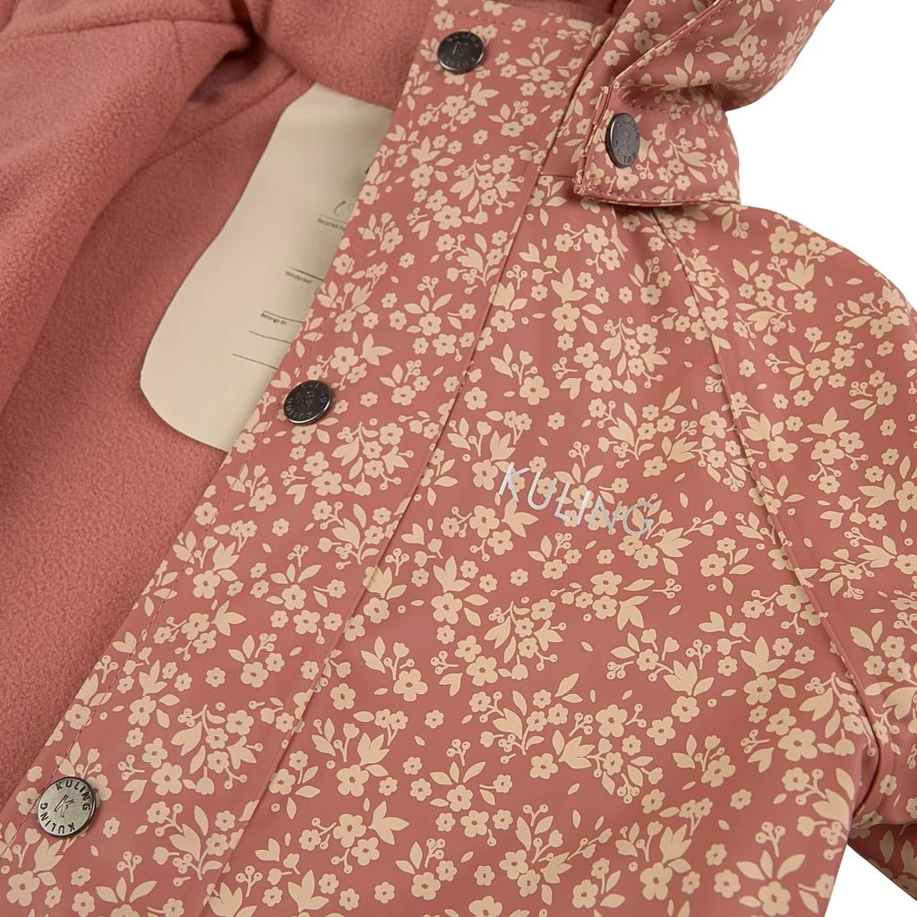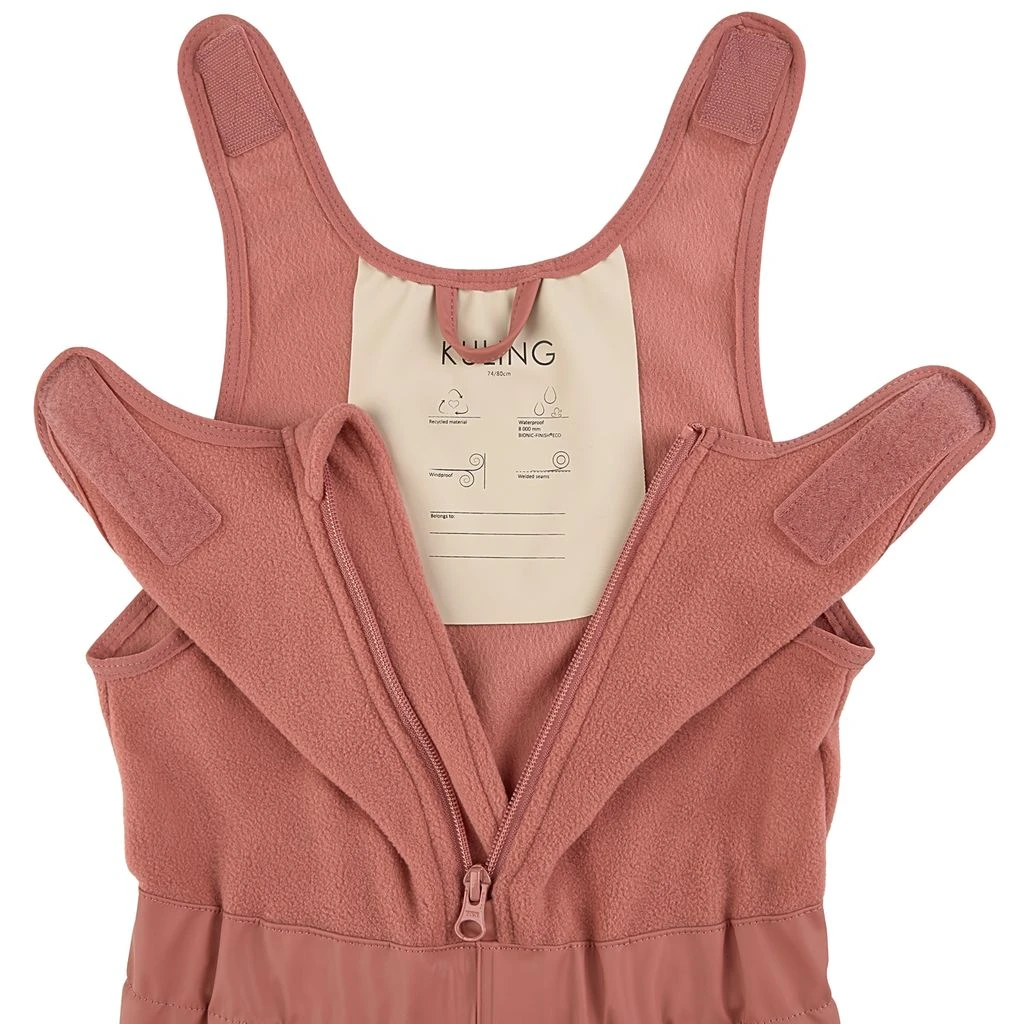 Time to jump through puddles. Pink Ottawa rain set by Kuling. The set has welded seams. It has a soft fleece lining, a jacket with a detachable hood, a YKK® zipper at the front and elasticated cuffs, pants with a fleece bodice, velcro closure at the shoulders, a YKK® zipper at the front, an elasticated waist and durable, adjustable silicone foot loops and reflective details for visibility.