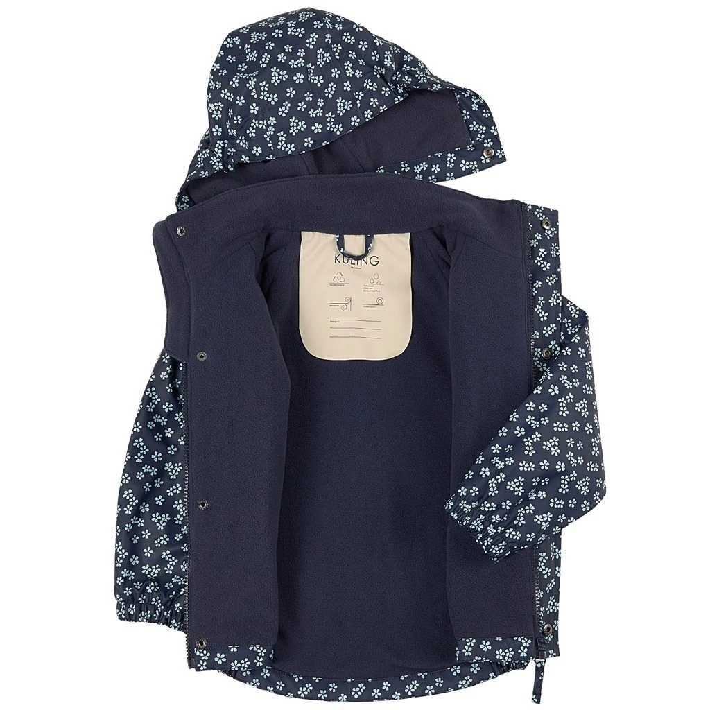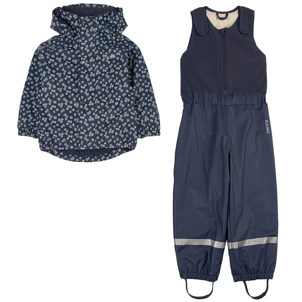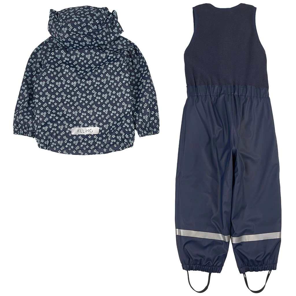Time to jump through puddles. Navy Ottawa rain set by Kuling. The set has welded seams. It has a soft fleece lining, a jacket with a detachable hood, a YKK® zipper at the front and elasticated cuffs, pants with a fleece bodice, velcro closure at the shoulders, a YKK® zipper at the front, an elasticated waist and durable, adjustable silicone foot loops and reflective details for visibility.