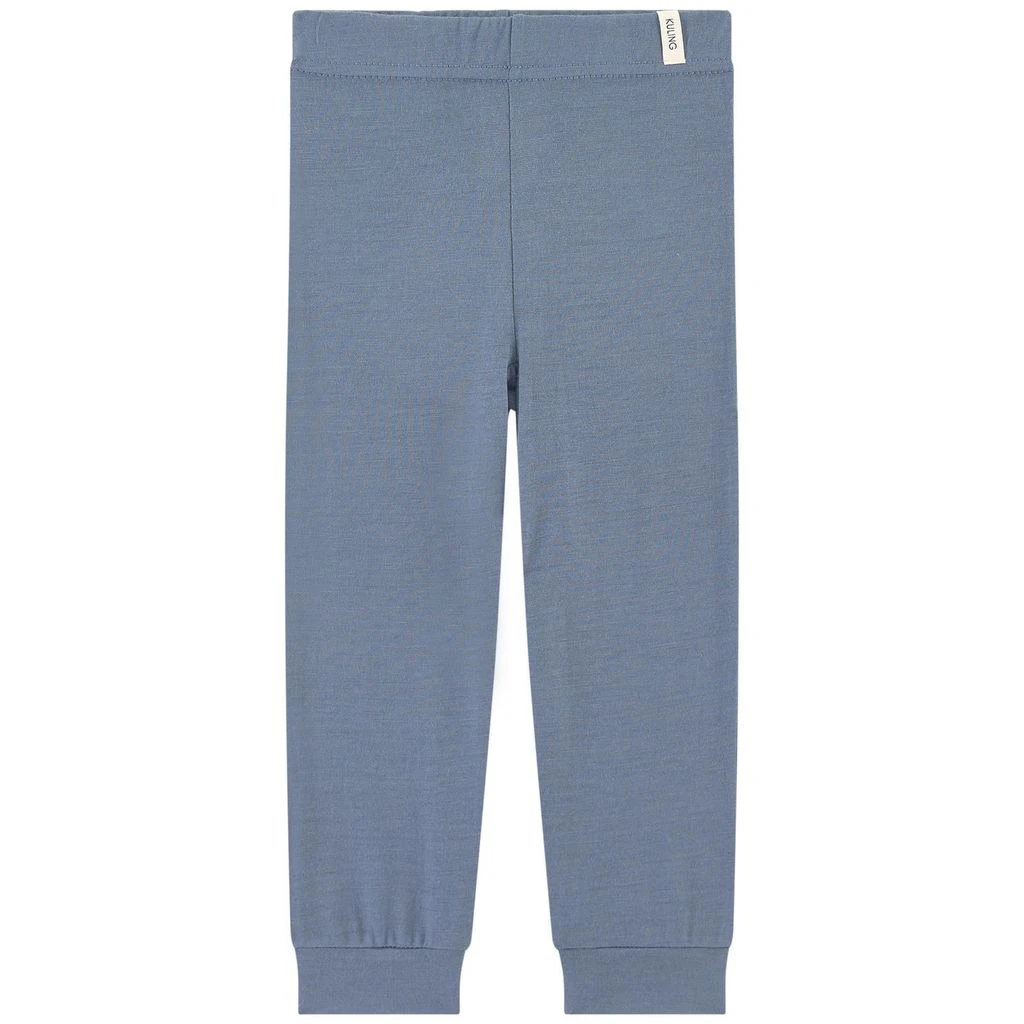 Denim blue trousers by Kuling. The trousers have an elasticated waist. They have ribbed cuffs.
