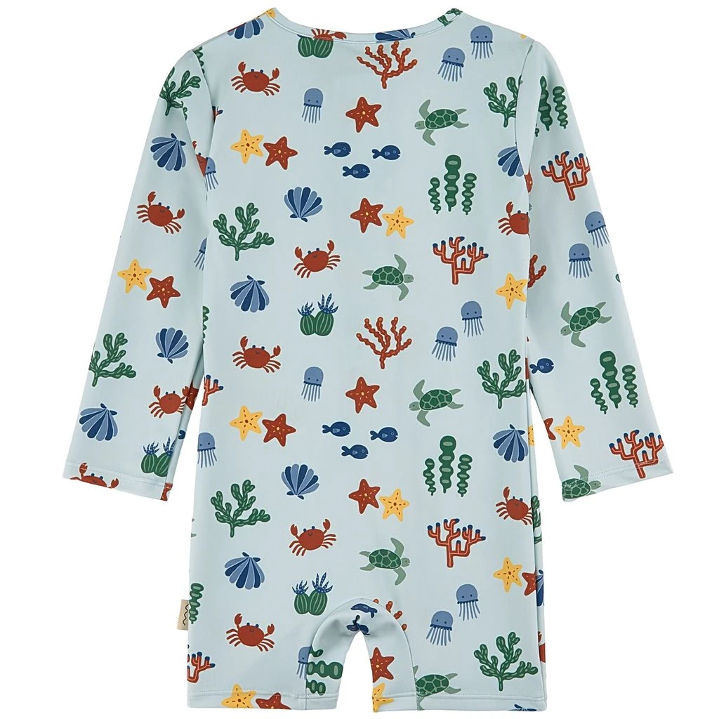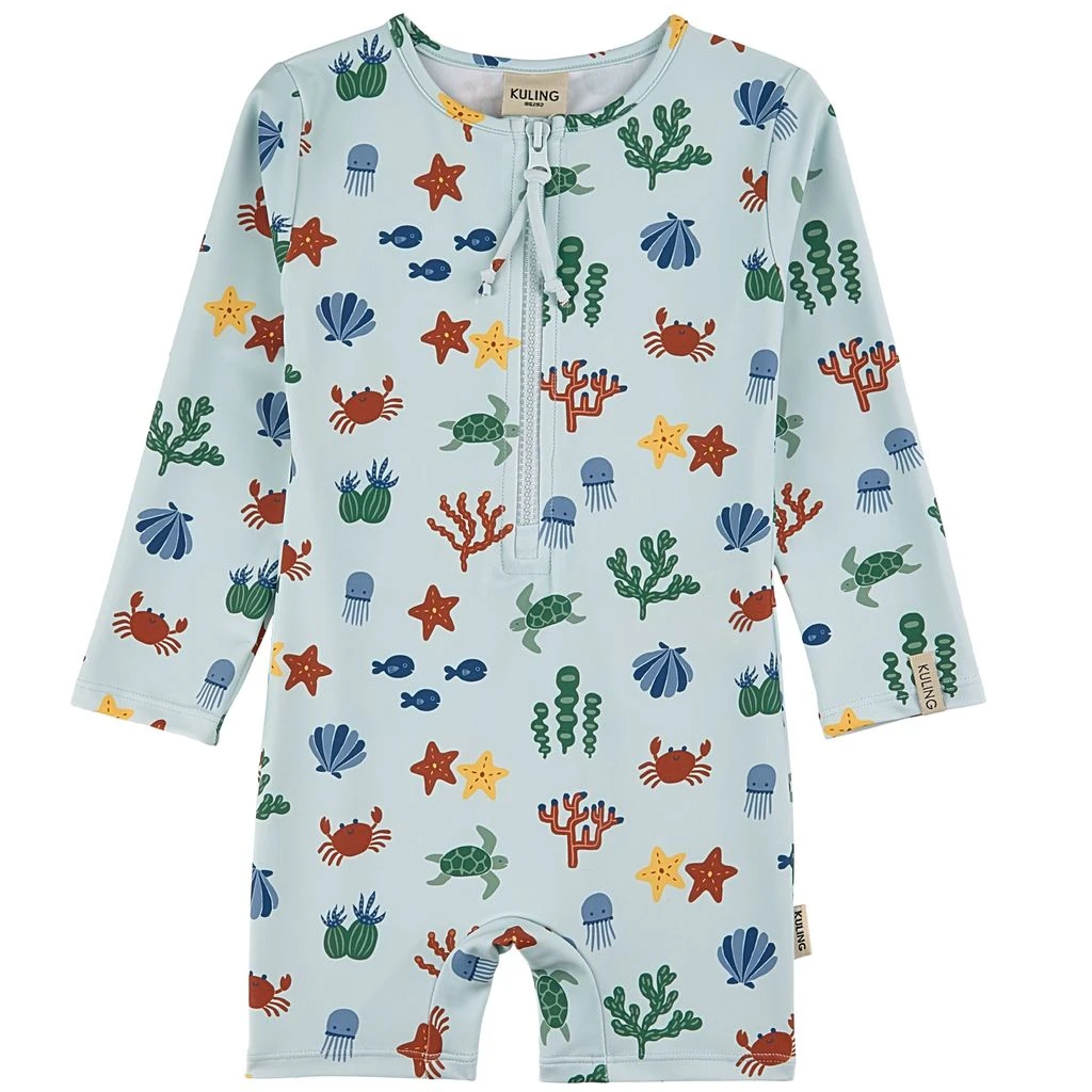 Perfect for some fun on the beach. Blue Paros one-piece rashguard swimsuit by Kuling. The one-piece rashguard swimsuit has a stretchy, quick-drying material.