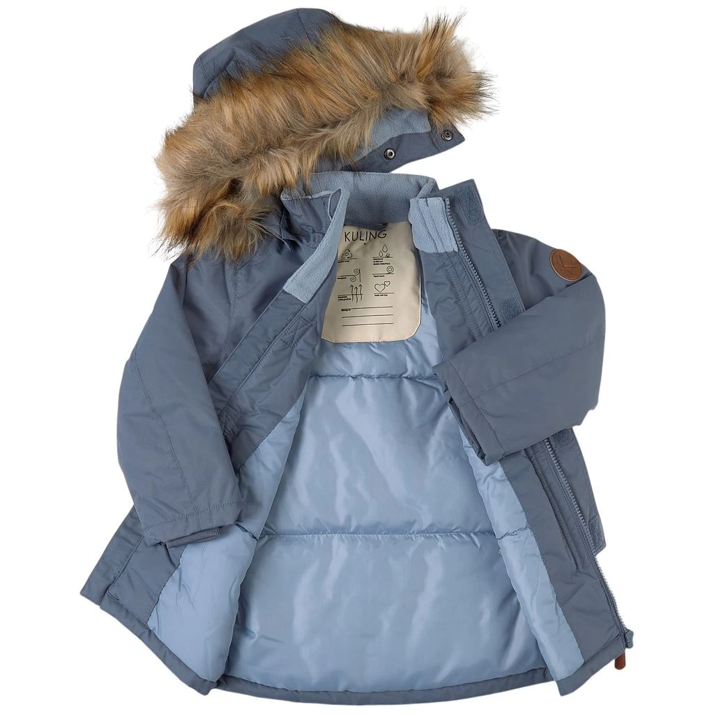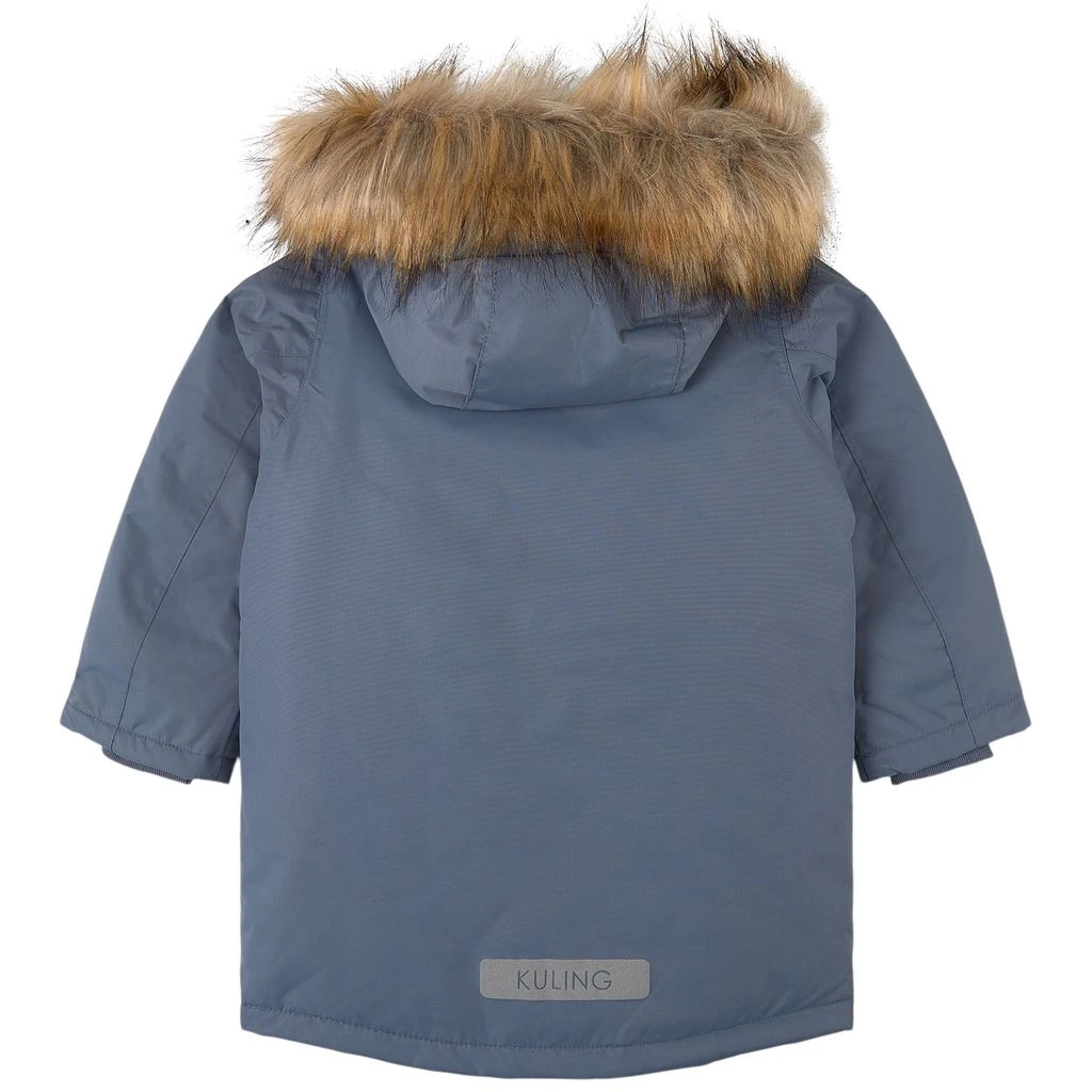 Blue Revelstoke parka by Kuling. The jacket has taped seams. It has a detachable hood with removable faux fur trim, a zip closure at the front, four front pockets and elasticated cuffs.