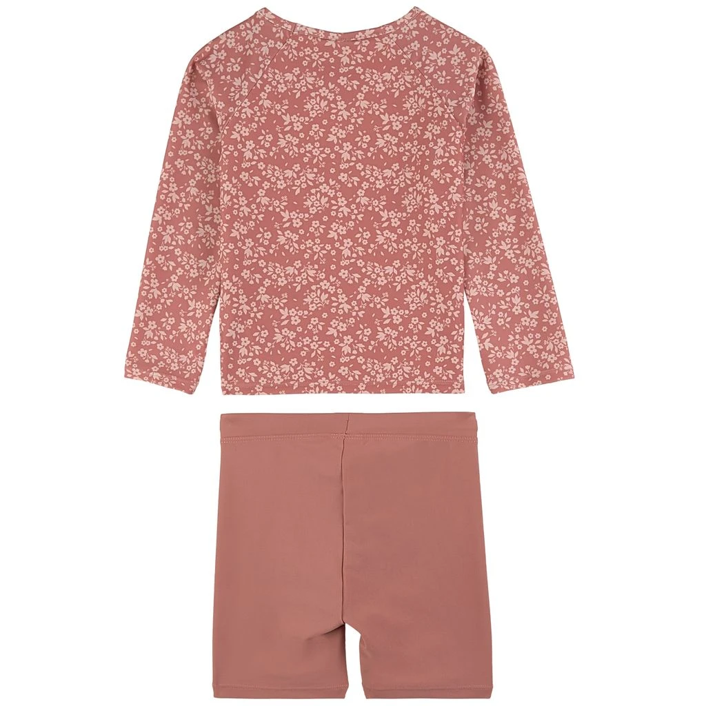 Perfect for some fun on the beach. Pink Rhodes Rashguard Set by Kuling. The Rashguard Set has a floral all-over print.