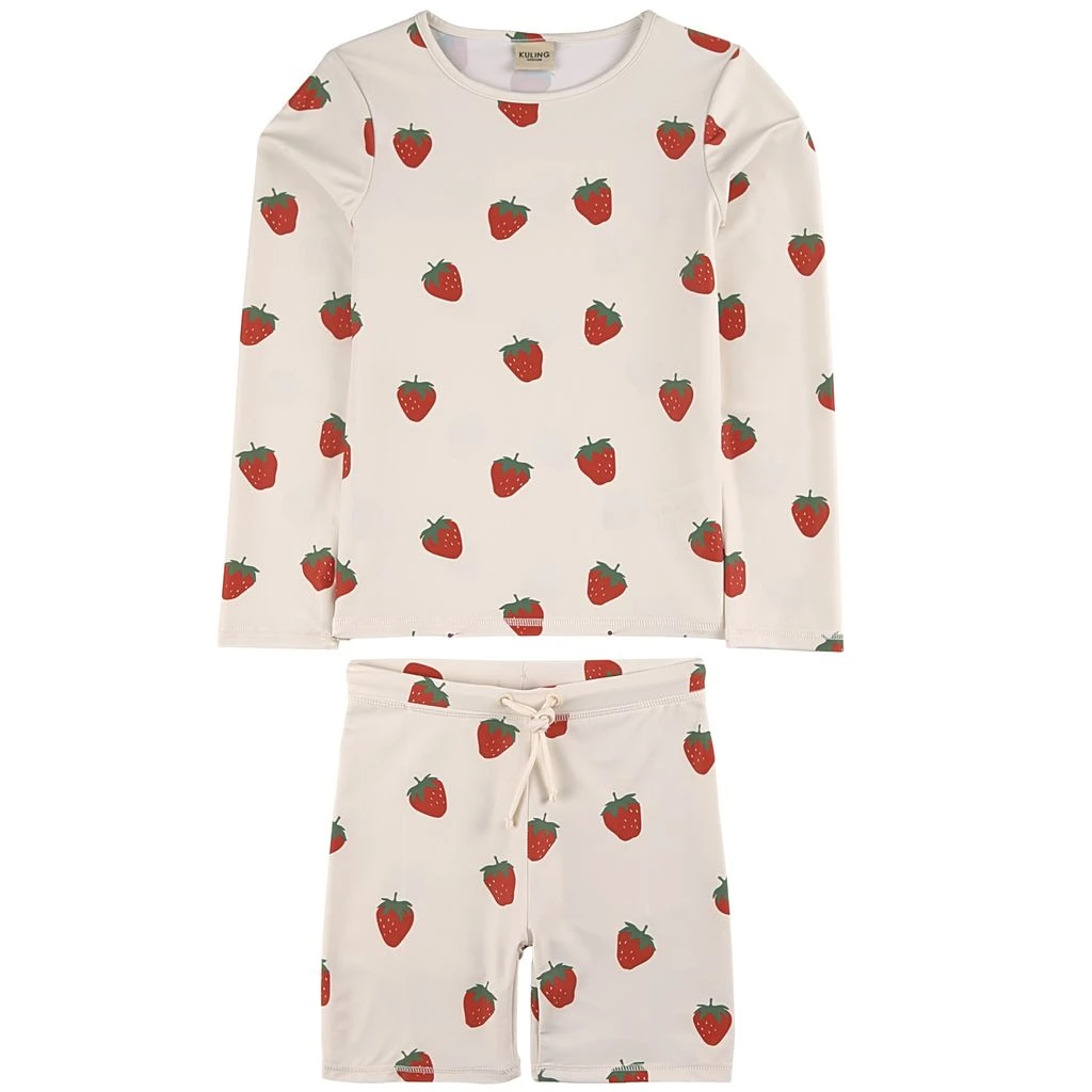 Perfect for those sunny days. Cream Rhodes Rashguard Set by Kuling. The Rashguard Set has a quick dry, stretchy material. It has a rash guard with a regular fit and a swim trunks with a lined front and an elasticated drawstring waist.
