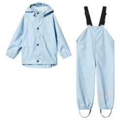 Keep out the elements with this cleverly designed pale blue rain set from Kuling. Skillfully crafted, the waterproof jacket features snap button closure, cuffed sleeves and reflective detailing, while the matching trousers have adjustable suspenders and silicone foot loops. Layer over thermal pieces and style with wellington boots for rainy days at the park.