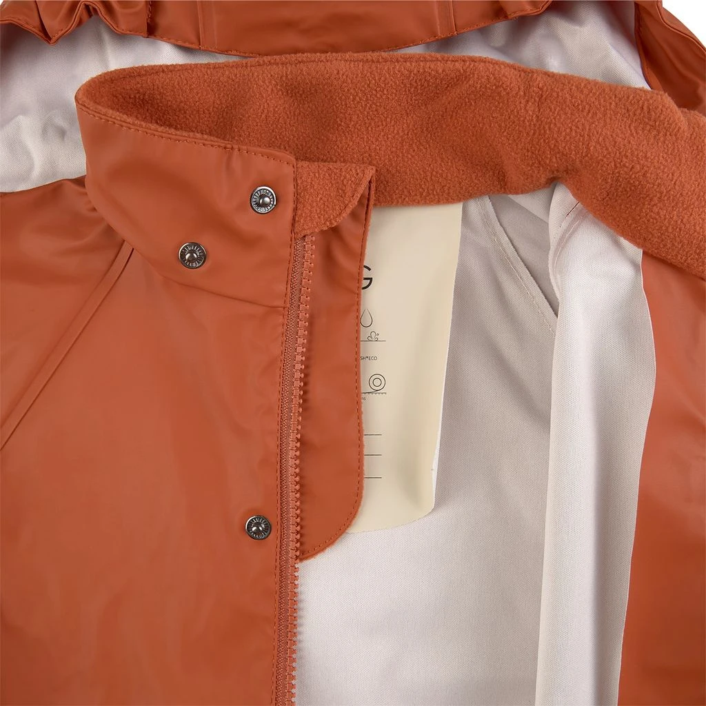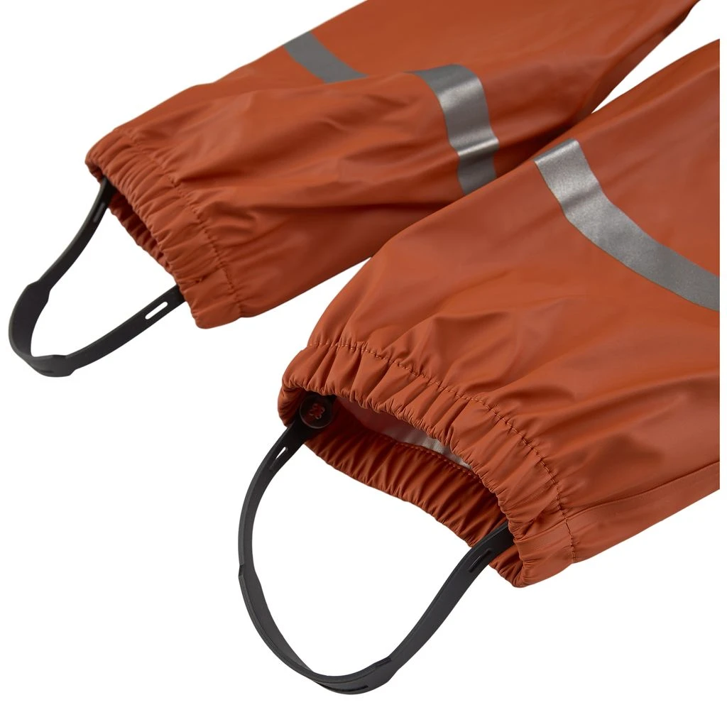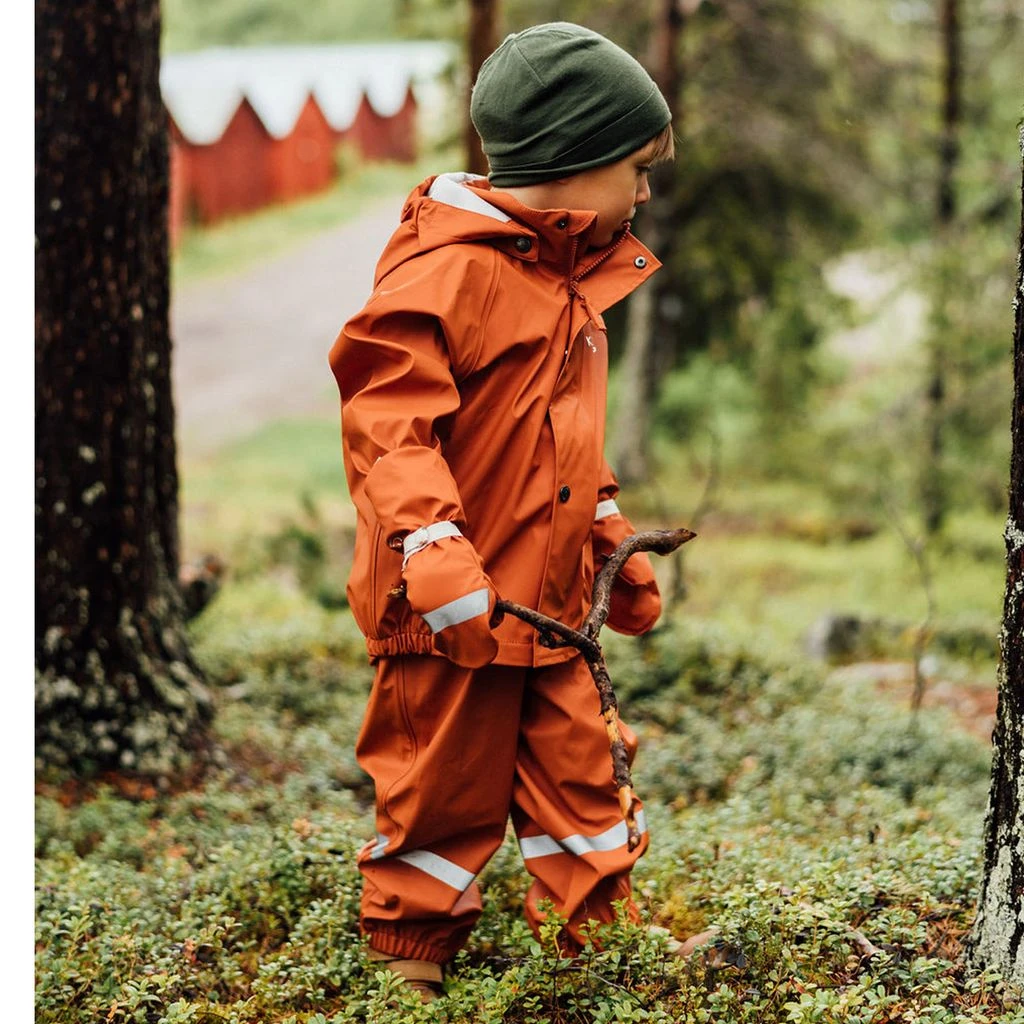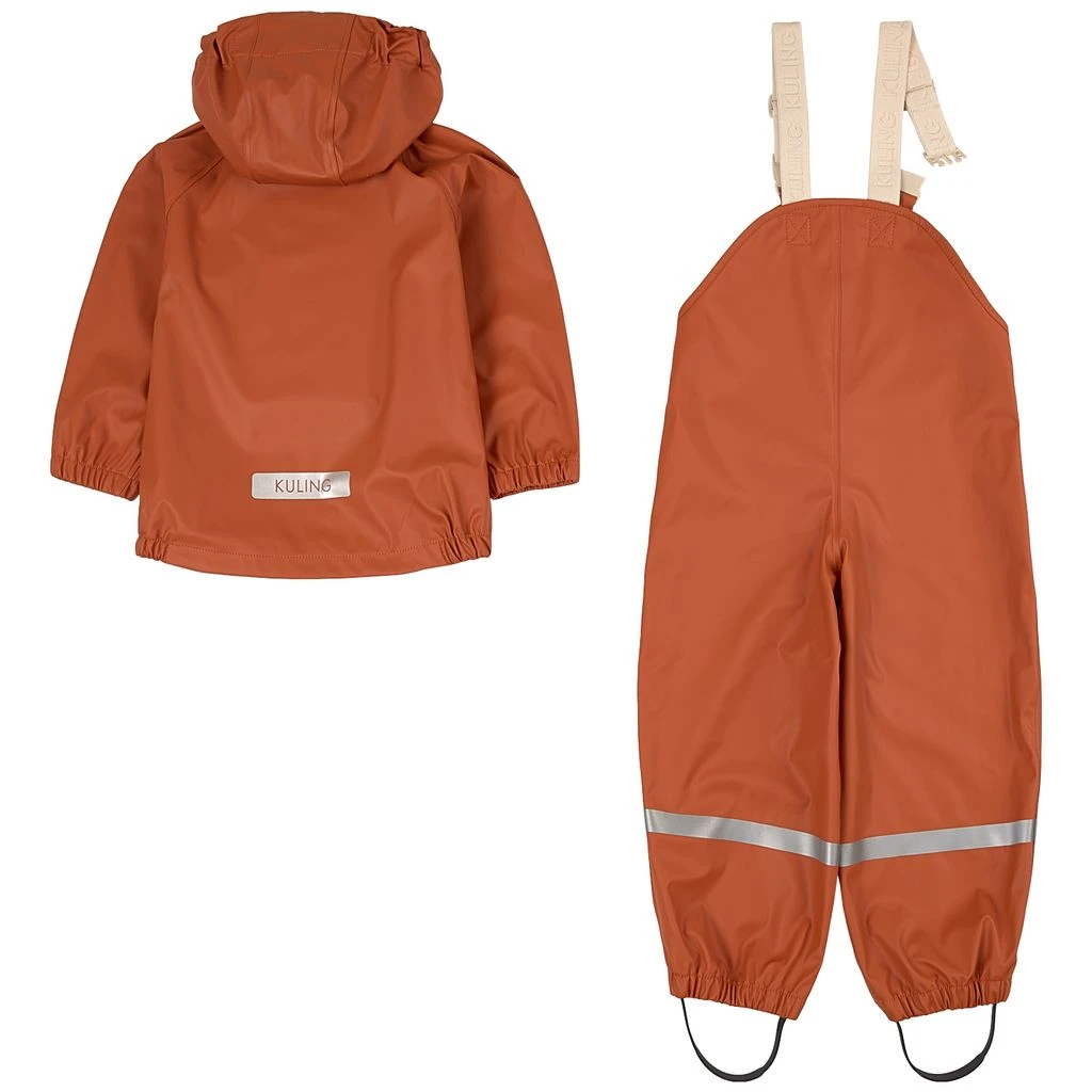 Time to jump through puddles. Brown San Marino rain set by Kuling. The set has welded seams. It has a jacket with a detachable hood, a zip closure at the front and elasticated cuffs, pants with adjustable, elasticated shoulder straps, snap buttons at the sides, a front pocket, elasticated cuffs and adjustable, detachable foot loops and reflective details for visibility.