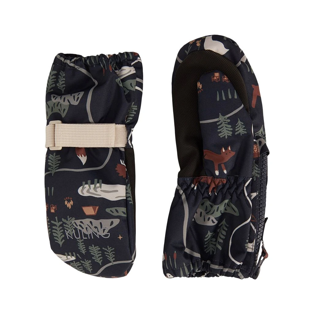 Keep little hands warm. Navy Tallinn mittens by Kuling. The mittens have taped seams. They have a fleece lining, an elasticated wrist with a velcro closure, a zip closure at the side and a reinforced palm.