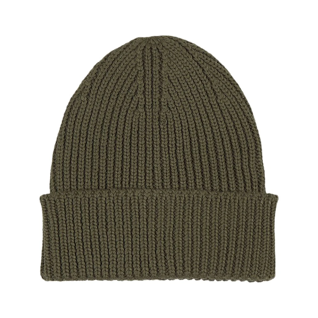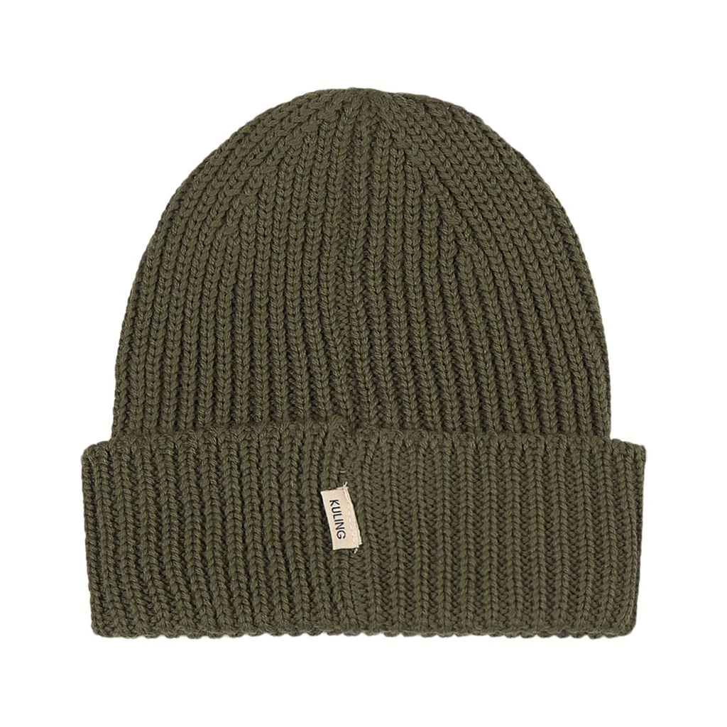 Keep little heads warm. Green Umeå hat by Kuling. The hat has a rib-knit design. It has a folded hem.