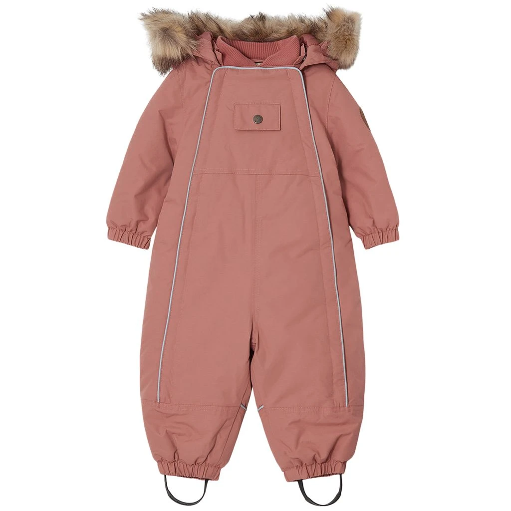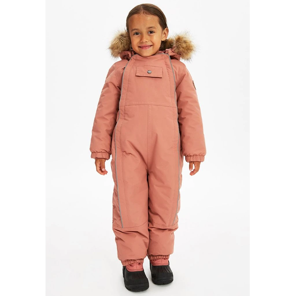 Be warm and comfy on winter adventures. Pink Val D’Isere snowsuit by Kuling. The snowsuit has taped seams. It has warm padding, a soft fleece lining at the back, a detachable hood with a detachable faux fur trim, a zip closure at the front, two front pockets, elasticated cuffs, durable, adjustable silicone foot loops and reflective details for visibility.