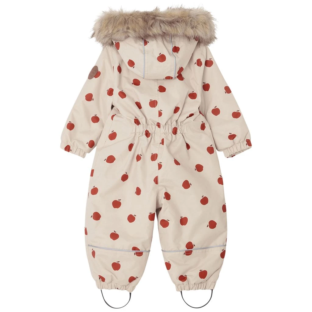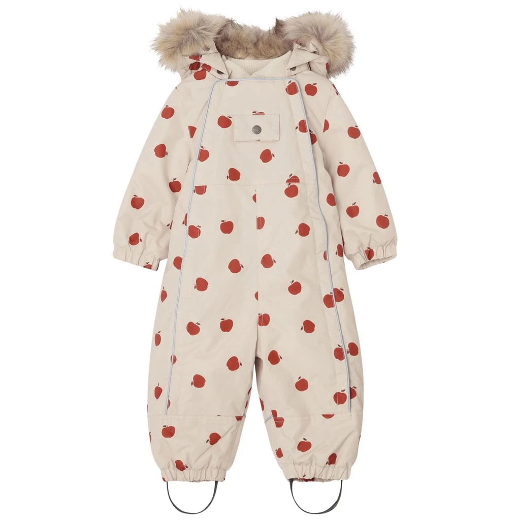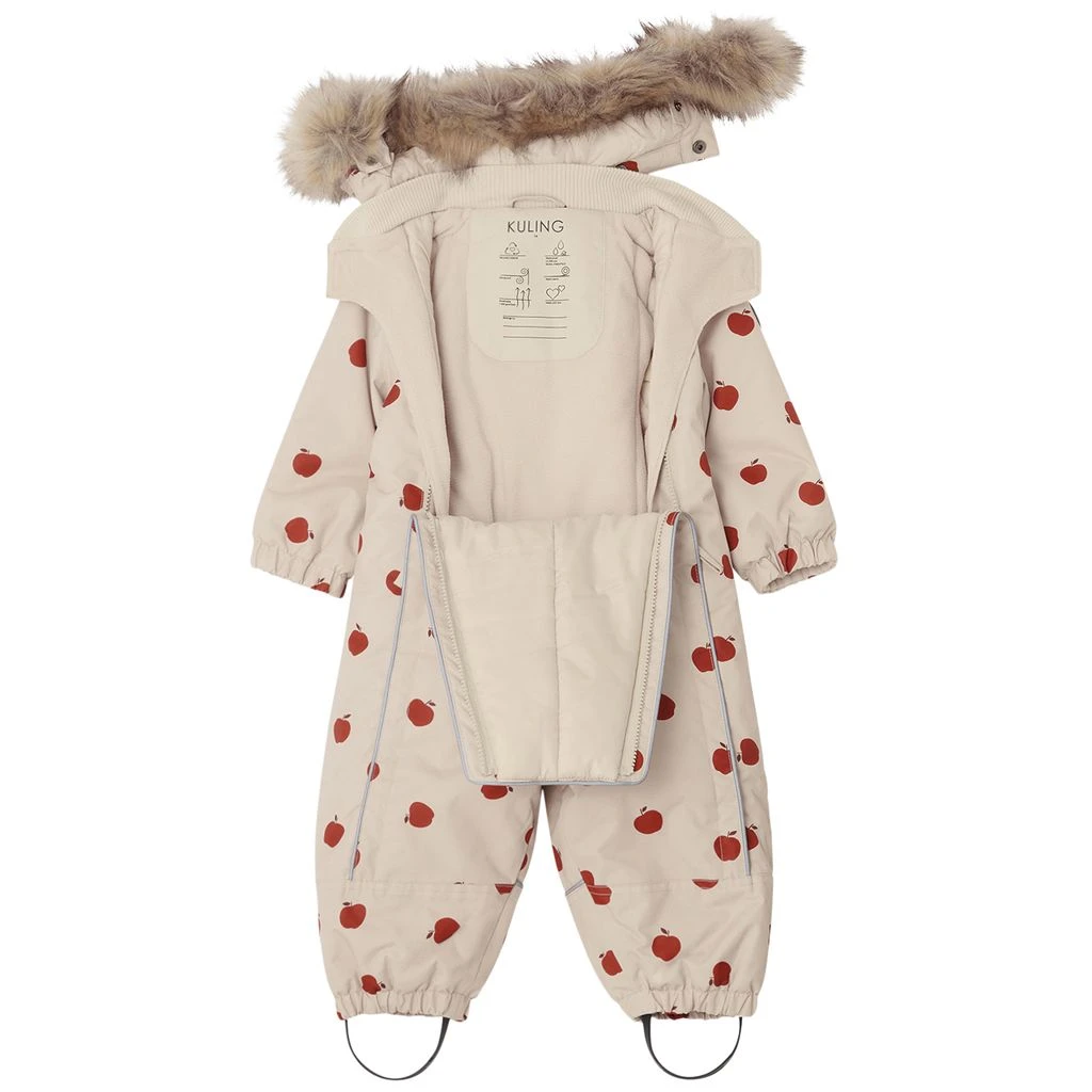 Be warm and comfy on winter adventures. Cream Val D’Isere snowsuit by Kuling. The snowsuit has taped seams. It has warm padding, a soft fleece lining at the back, a detachable hood with a detachable faux fur trim, a zip closure at the front, two front pockets, elasticated cuffs, durable, adjustable silicone foot loops and reflective details for visibility.