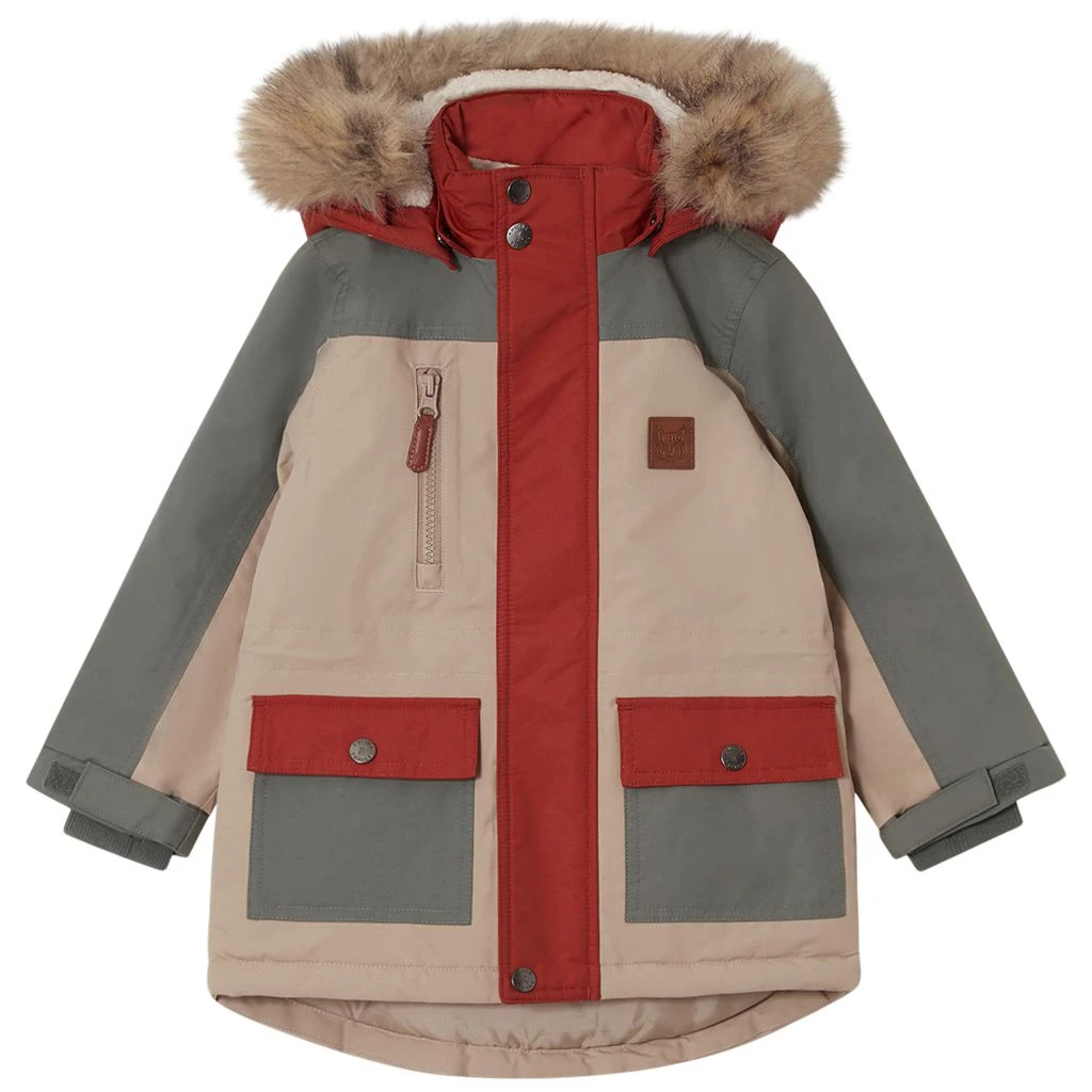 Be warm and comfy on winter adventures. Green, beige Val Thorens parka by Kuling. The jacket has taped seams. It has a detachable hood with faux fur trim, a zip closure at the front, an adjustable waist, two front pockets, a zip pocket at the chest and a reflective detail for visibility.