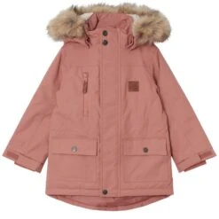 Be warm and comfy on winter adventures. Pink Val Thorens parka by Kuling. The jacket has taped seams. It has a detachable hood with faux fur trim, a zip closure at the front, an adjustable waist, two front pockets, a zip pocket at the chest and a reflective detail for visibility.