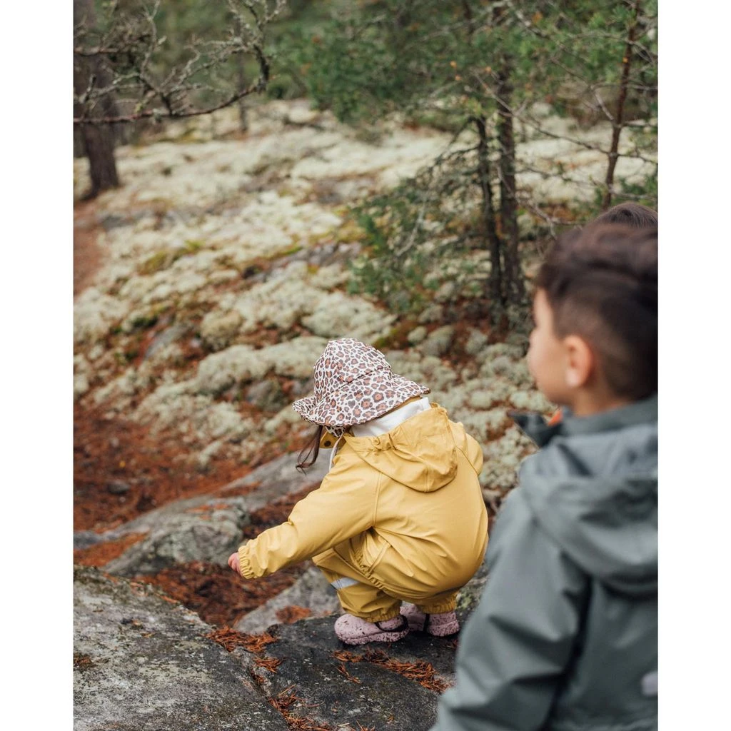 Rainy days won’t stand a chance. Beige Vasa rain hat by Kuling. The rain hat has welded seams. It has an asymmetrical brim, fleece lined ear flaps and tie straps at the chin.