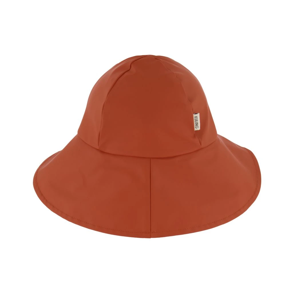 Brown Vasa rain hat by Kuling. The rain hat has welded seams. It has an asymmetrical brim, fleece lined ear flaps and tie straps at the chin.