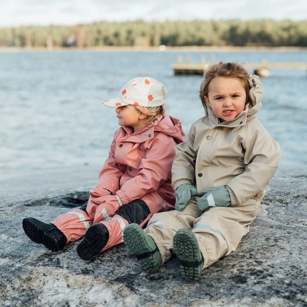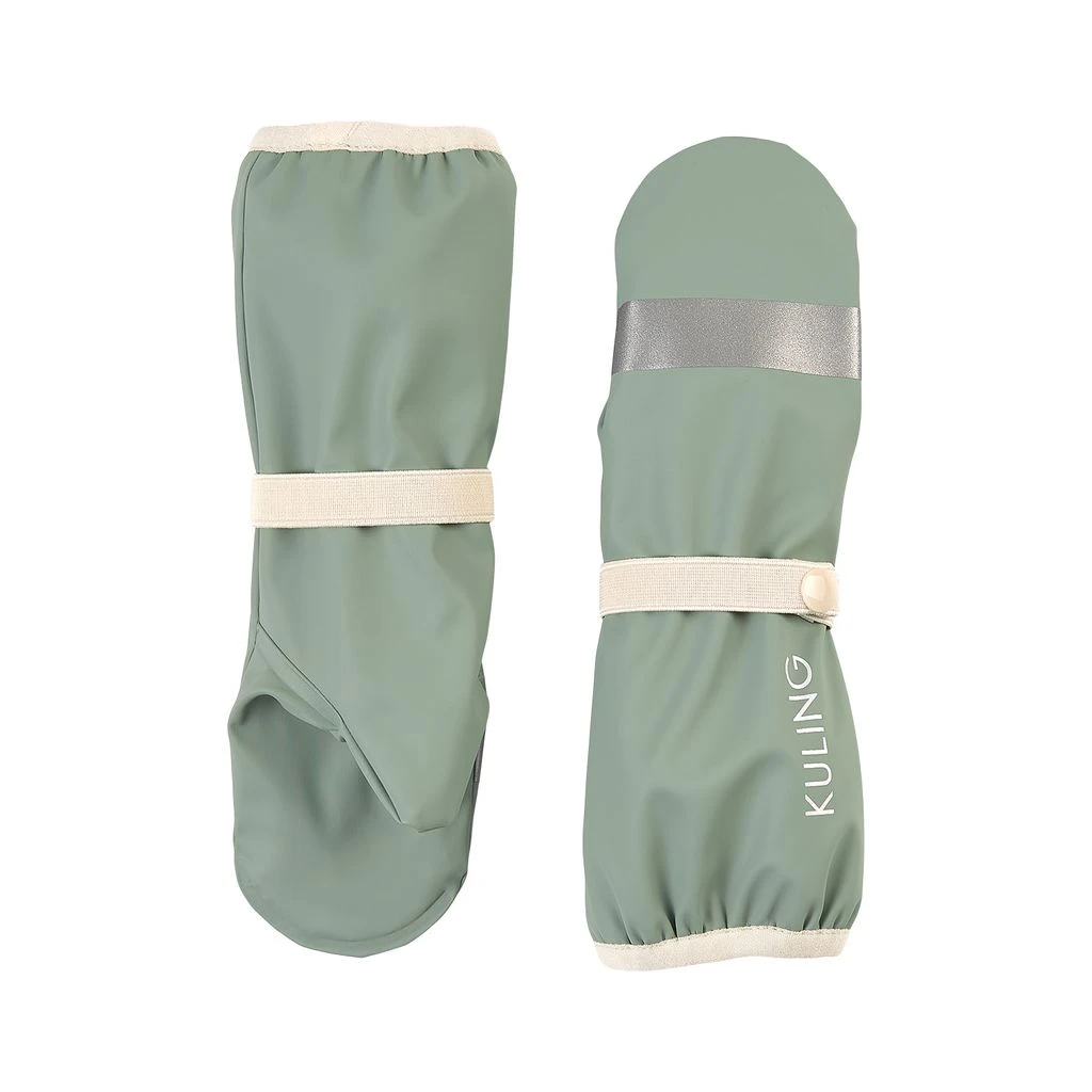 Rainy days won’t stand a chance. Green Vilnius rain mittens by Kuling. The rain mittens have welded seams. They have a soft fleece lining, an elasticated strap with snap button at the wrist, elasticated cuffs and reflective details for visibility.