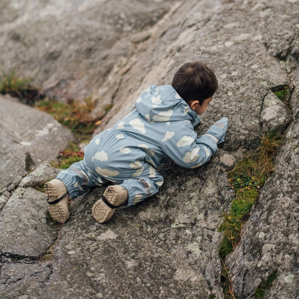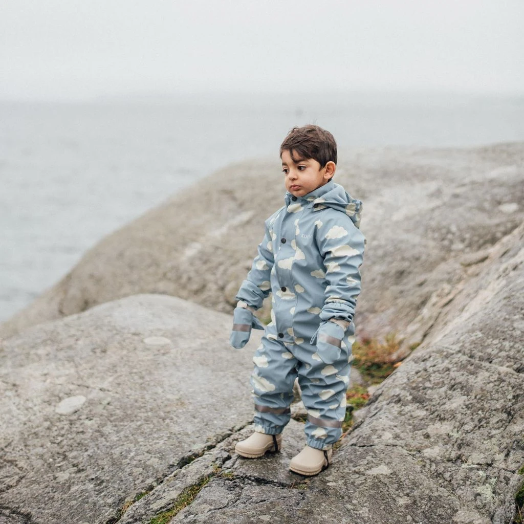 Rainy days will be so much fun. Blue Vilnius rain mittens by Kuling. The rain mittens have welded seams. They have a soft fleece lining, an elasticated strap with snap button at the wrist, elasticated cuffs and reflective details for visibility.