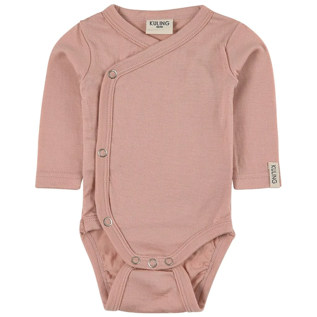 Pink wrap body by Kuling. The wrap body has snap buttons between the legs and at the side.