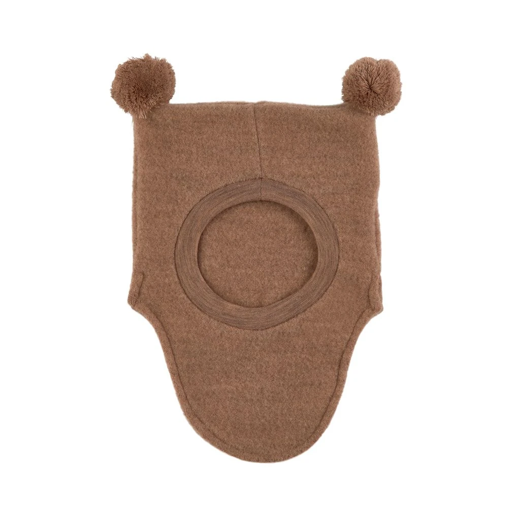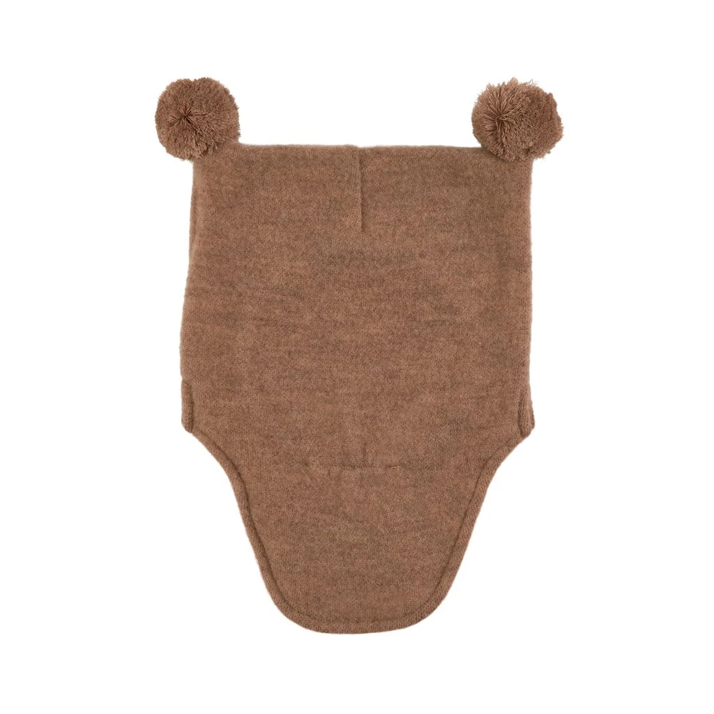 Keep little heads warm. Brown balaclava by Kuling. The balaclava has a soft fleece material. It has a ribbed opening and pom-poms at the top.